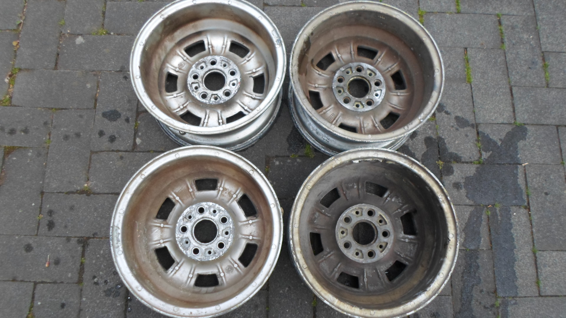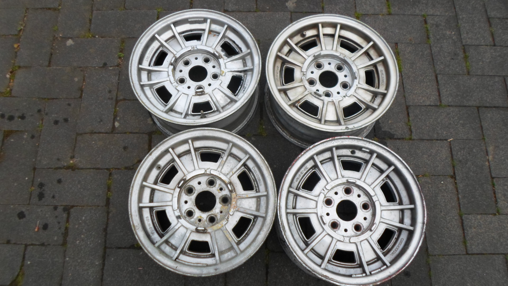 a) original für die 2L Fiat Dinos: ohne Hump und mit durchgehender Mittelzentrierung. Die sind von 1967 und wurden nach dem Glasperlstrahlen jetzt neu lackiert. Die Felgen haben die original Nummer 135AC100 und sind wirklich in tollem Zustand, Jetzt VB 550 Euro siehe Bilder.