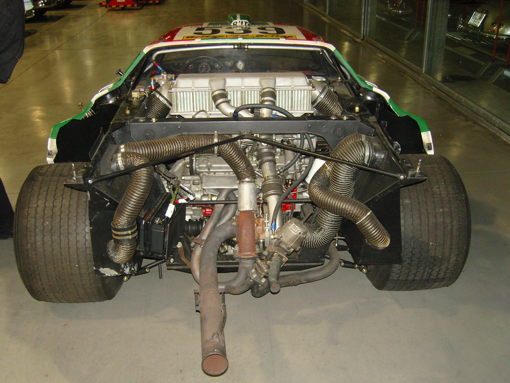 Der Lancia Stratos G5 hatte die leistungsstärkste Ausbaustufe des Dino V6 Motors, wenn auch nicht die haltbarste, da der Motor in dieser Konfiguration zur Überhitzung neigte. Der Lancia Stratos Turbo Gruppe 5 hat einen 3LEM-502 KKK Turbolader (Bild mitte unten) und kam auf 560 PS (!) Leistung bei 2,4 Liter Hubraum. Im Bild sieht man oben den Ladeluftkühler, hinter der oberen Querstrebe ist die mechanische Einspritzung. In 1976 wurden zwei Stratos G5 vom Team um Mike Parkes gebaut worden, Carlo Facetti war für das Motorentuning zuständig. Einer der beiden G5 ist leider in Österreich bei einen Rennen abgebrannt, der Alitalia im Bild mit etwas längerem Radstand hat überlebt und ist heute wohlbehalten Teil einer Sammlung. Das Bild oben habe ich bei Arbeiten an der Zündung (eine seltene Renn Dinoplex