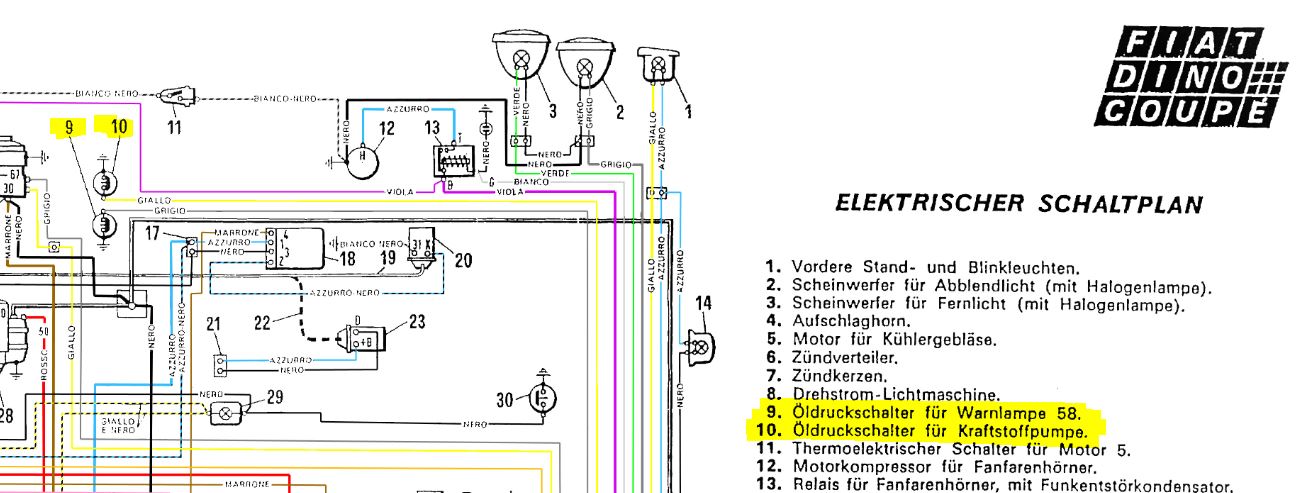 am Wiring Diagram für den Fiat Dino 2400 (Coupé und Spider) ist der Öldruckschalter für die Kraftstoffpumpe (10) vor dem Öldruckschalter für die Warnlampe (9) von vorne aus gesehen..