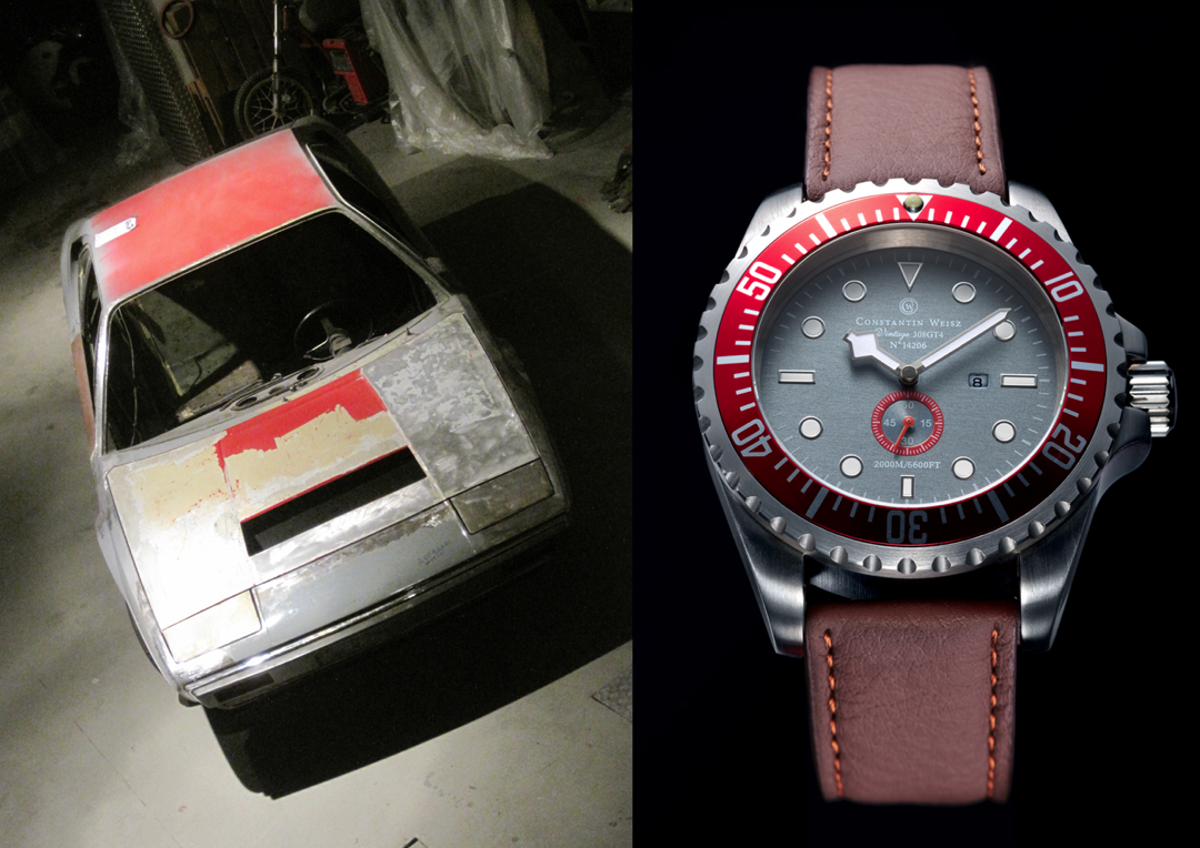 Hier ist noch eine Uhr, die allerdings auch nicht historisch ist. Sie stammt von einem Bekannten, der sie in kleiner Auflage mit Originalteilen aus seinem restaurierten 308GT4 hergestellt hat. Der Alu-Unterboden wurde zum Zifferblatt umgebaut, die Fahrgestellnummer ist vermerkt, die Farbe ist die Originalfarbe des Autos (Grigio Fumo Met 691) und das Armband wurde aus dem original Leder der Sitze gemacht. Im Gehäuse tickt ein altes historisches Uhrwerk aus den 70ern.