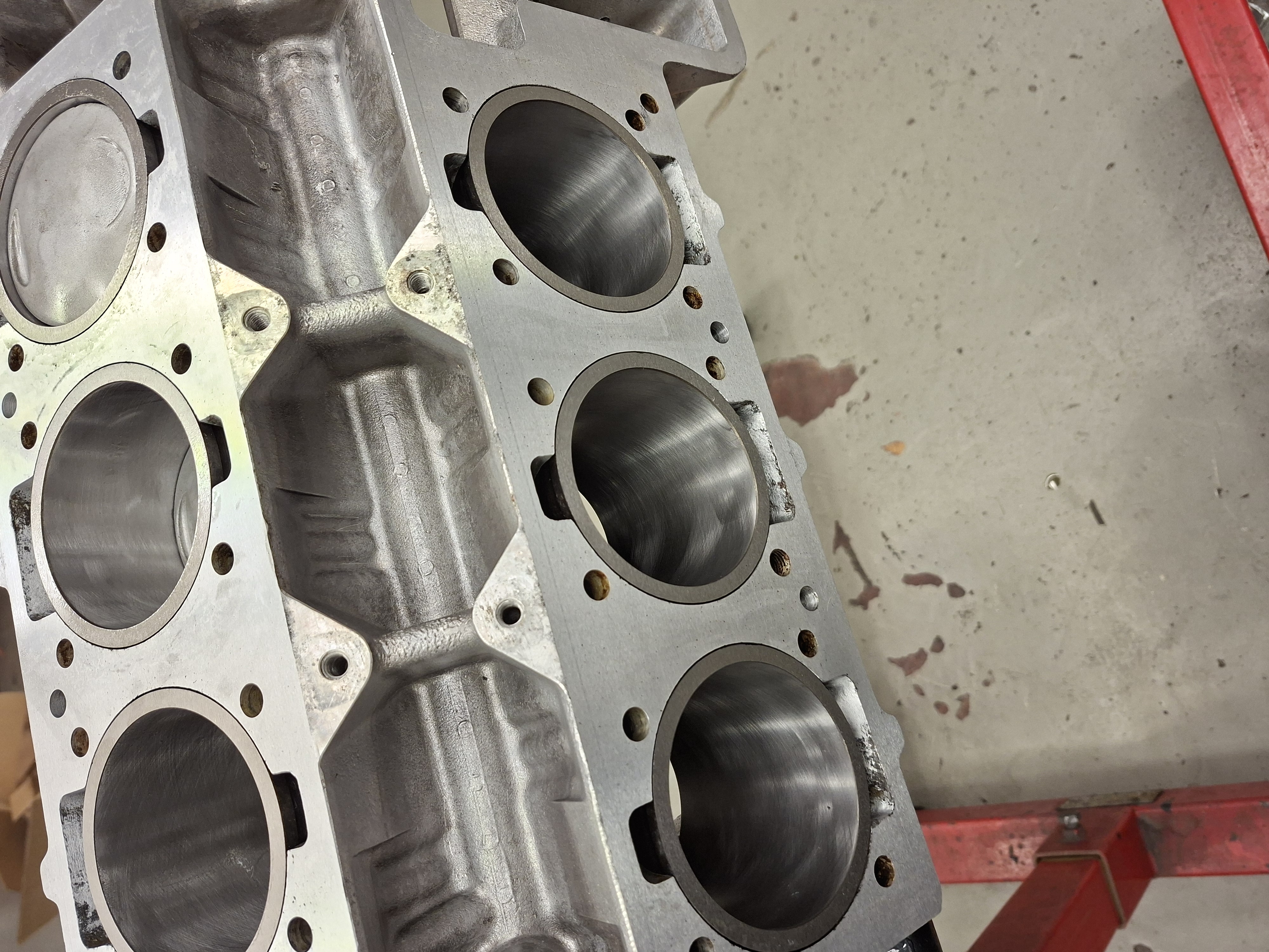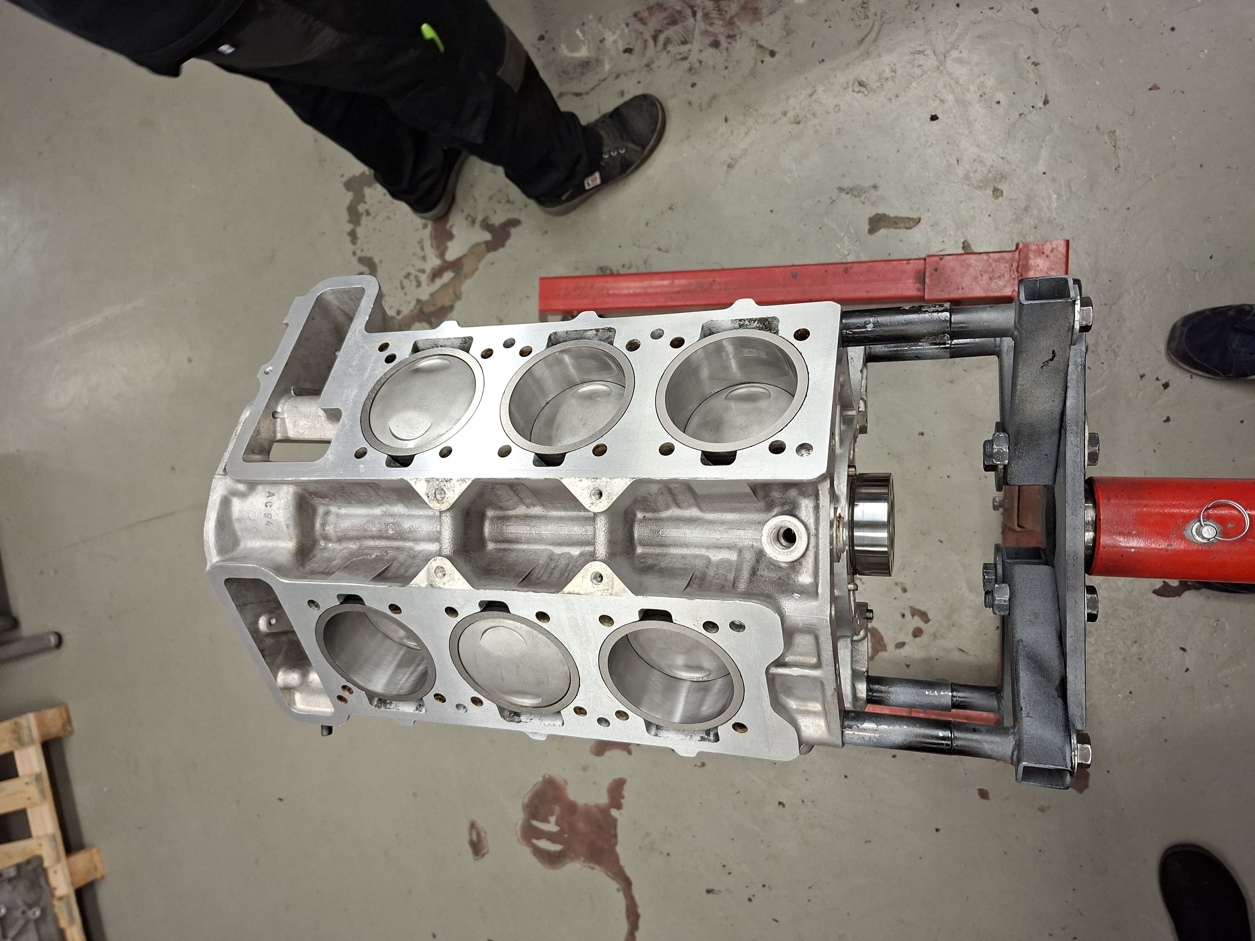 Der 2 Liter Motor wurde/wird komplett überholt. Die Buchsen wurden gezogen, der Block gereinigt und geplant. Die Buchsen wurden dann wieder eingesetzt und aufs korrekte Überstandsmass geplant - Massarbeit. Anschliessend wurden die Buchsen gehont, mit einer sogenannten Honbrille, um die Spannung durch die Köpfe abzubilden. So gibt es wieder runde Laufbahnen mit schönem Honbild.
