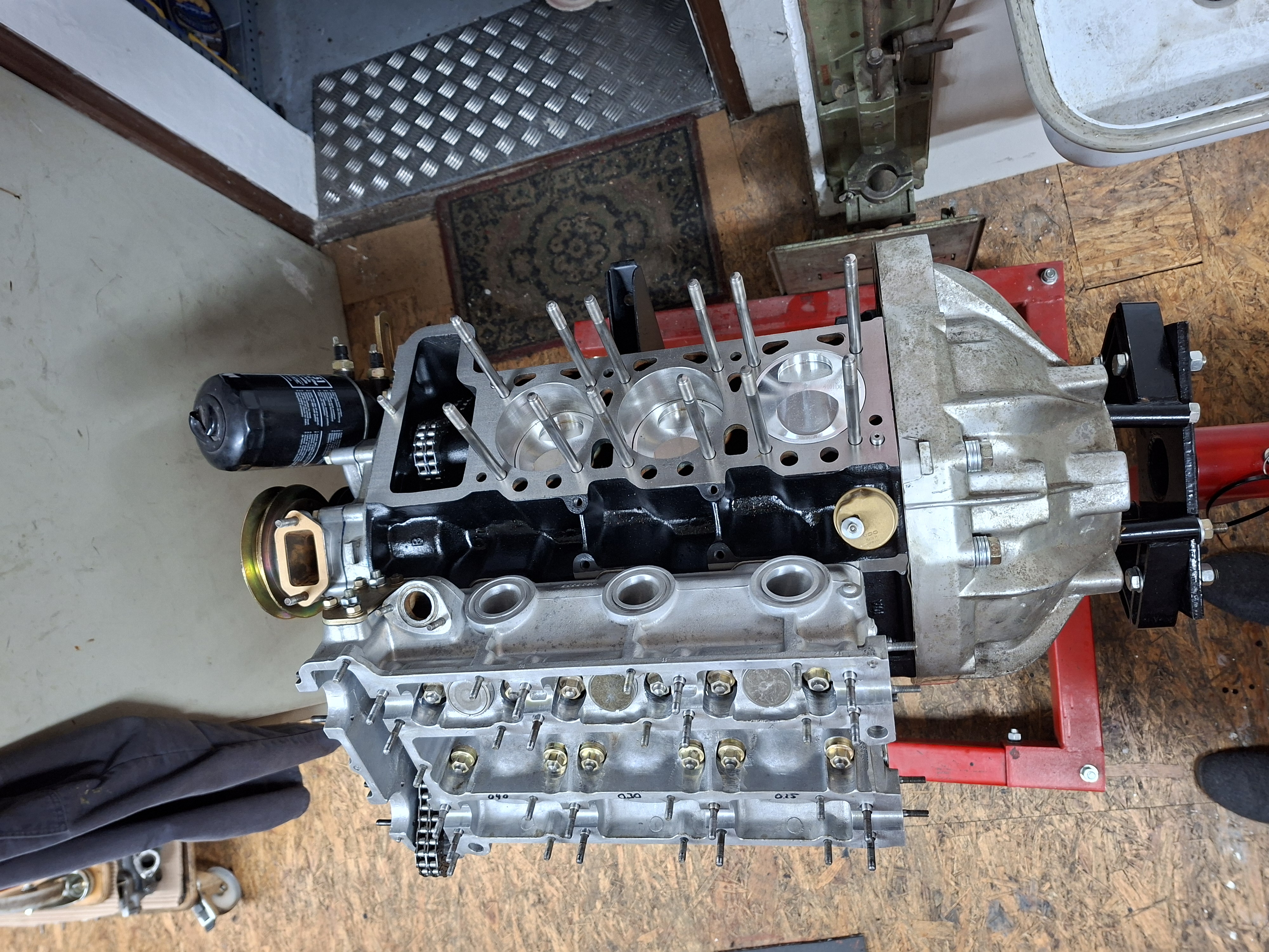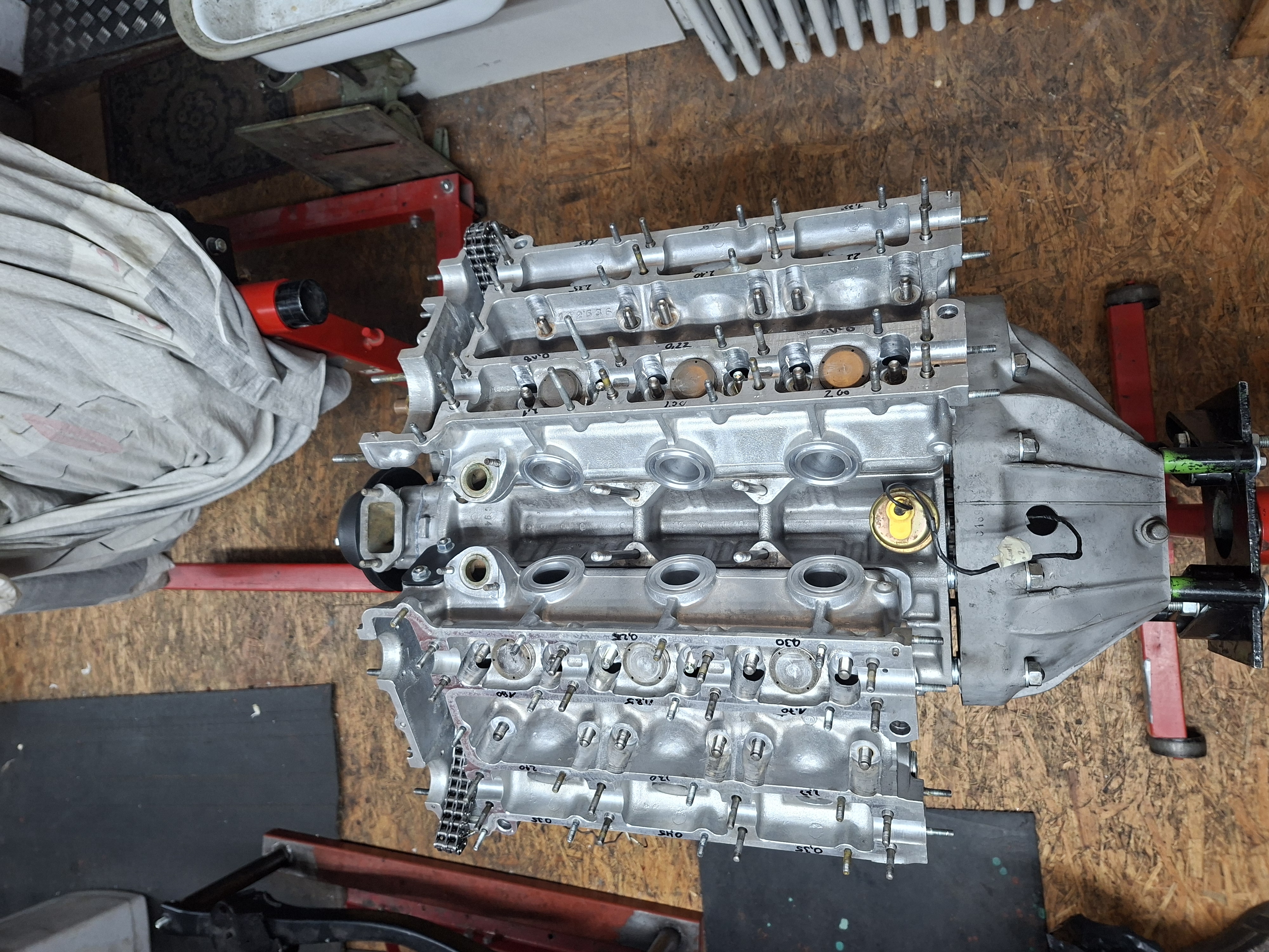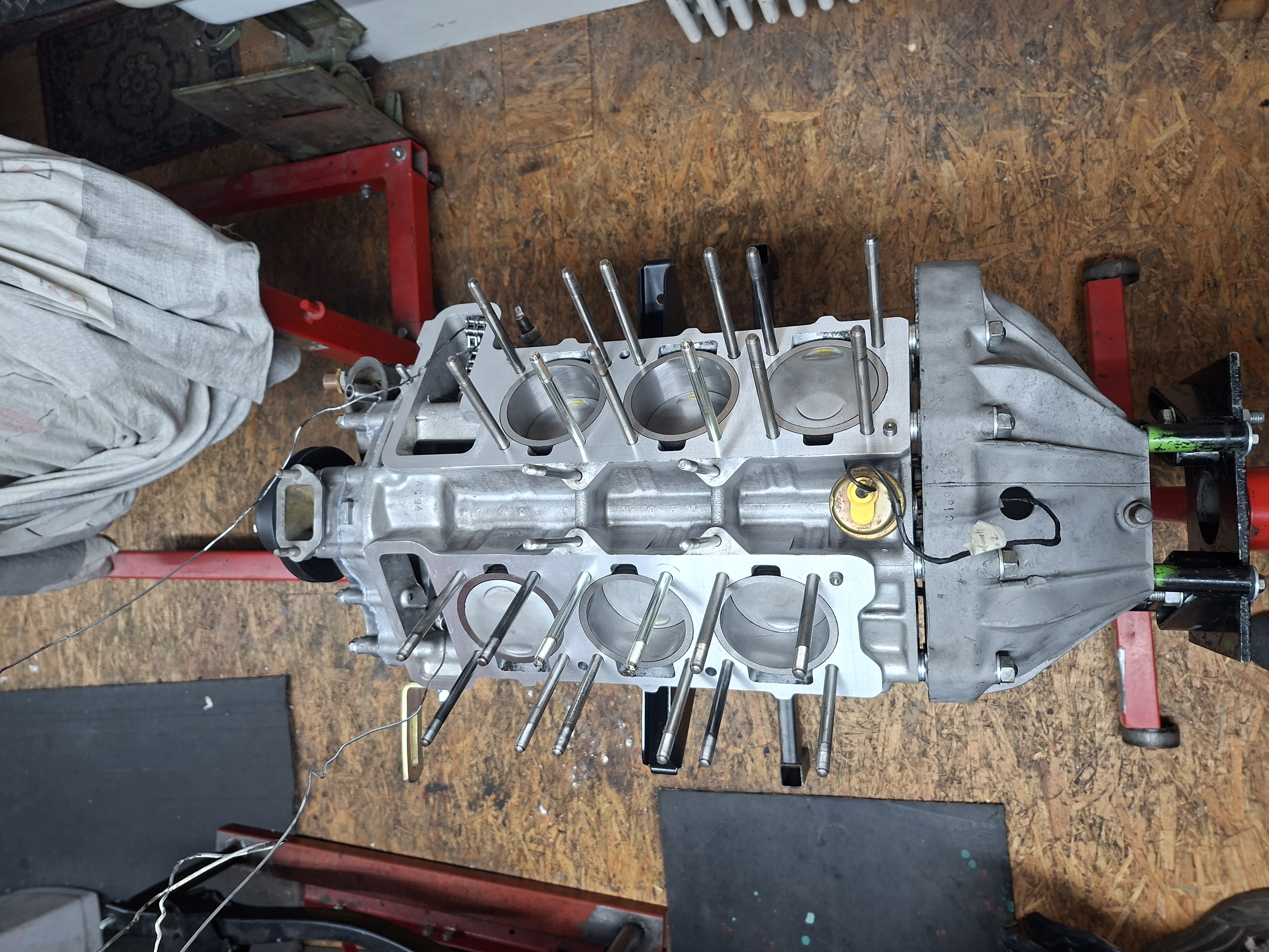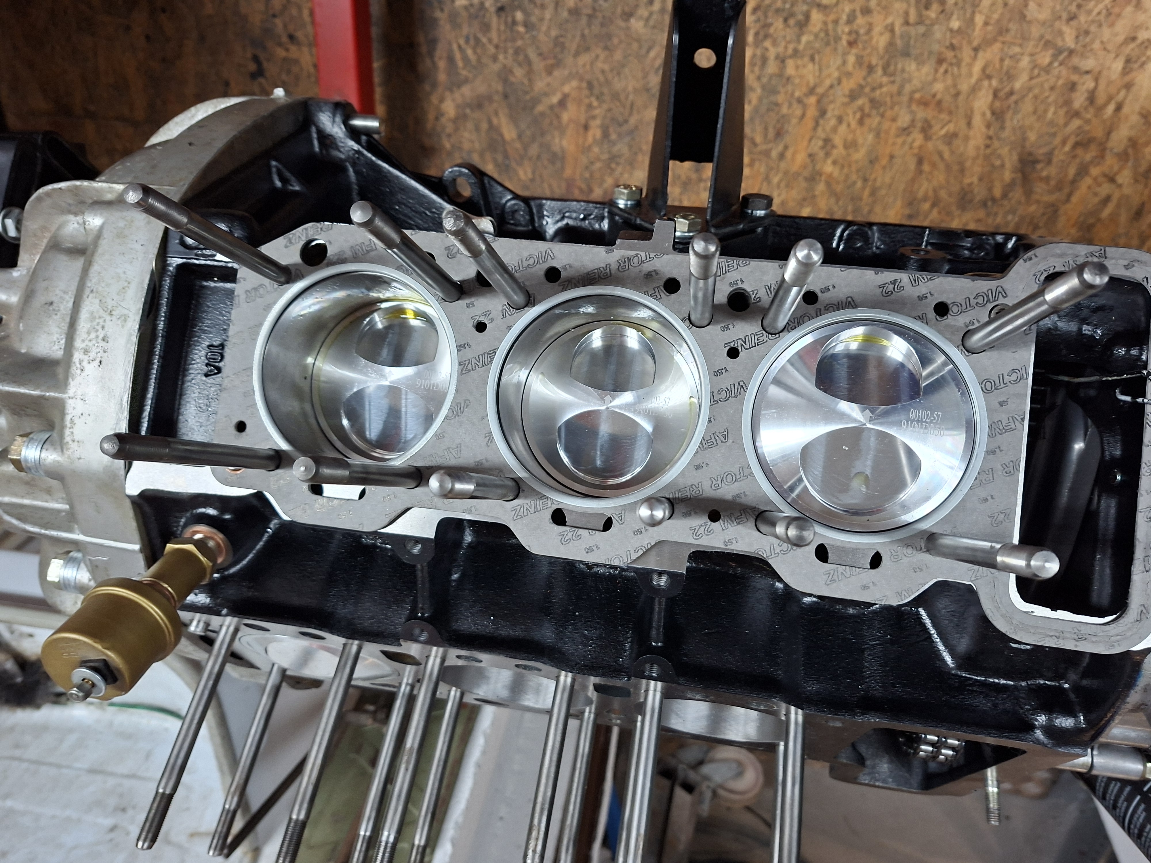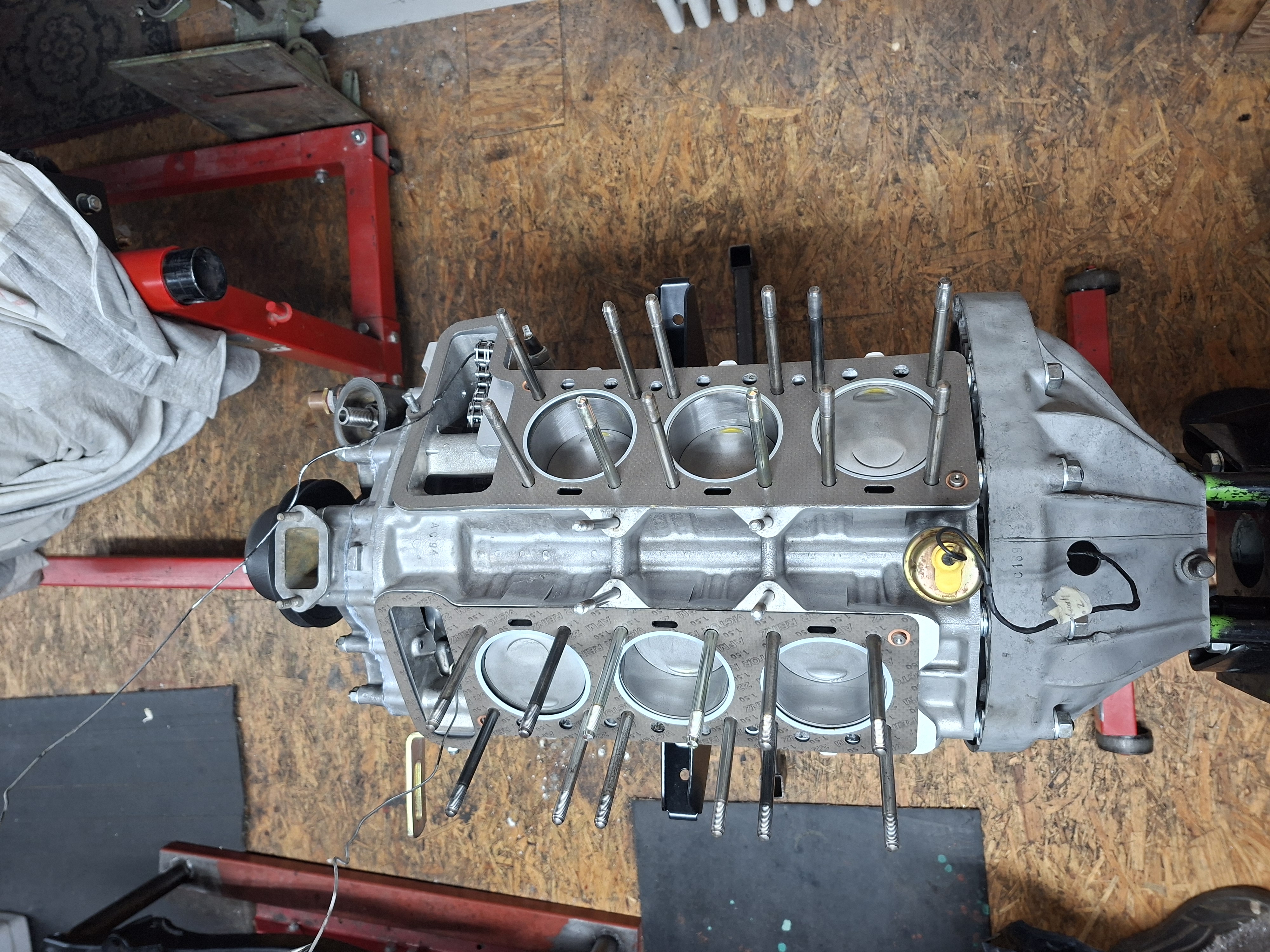 Eigentlich kein schwerer Akt, wenn alles gut vorbereitet ist: Köpfe und Blöcke plan und sauber, Stehbolzen sauber eingedreht, Ventile eingebaut und im Einstellbereich, Öldüsen und Passhülsen eingesetzt, Kettenspanner gespannt geklemmt (2,4er), die neuen Kopfdichtungen liegen bereit... dann schön in Ruhe in mehreren Schritten kreisförmig das korrekte Drehmoment aufbringen...ich war dann aber doch froh, dass alles "sitzt" und sich nichts komisch weich angefühlt hat.
