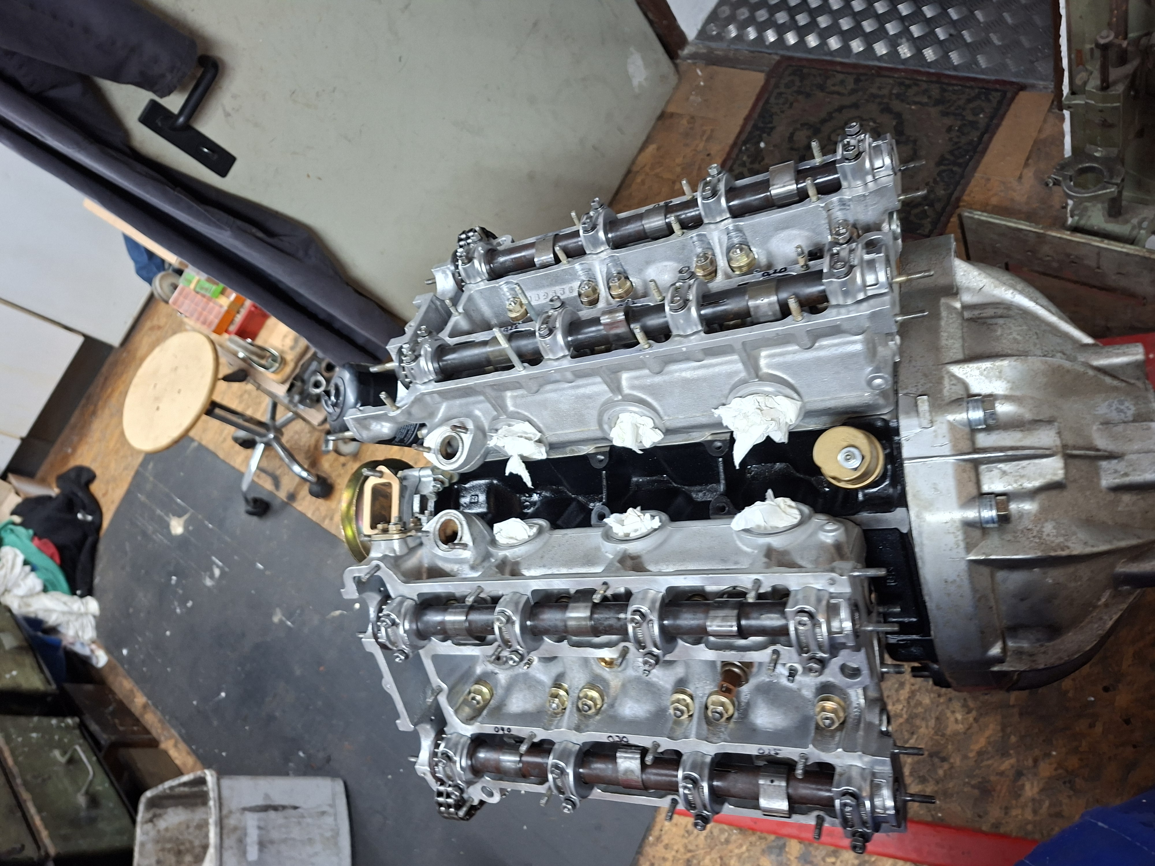 Dann ging es beim 2,4 Motor ans Einstellen von Steuerzeiten und Kettenspannung, bei ausgebautem Motor geht das deutlich einfacher als im Motorraum, aber auch so brauchte es einige Durchläufe, bis sich überall überlappende Löcher auf Zahnrad und Nockenwellenflansch bei korrekter Kettenspannung fanden. Ich musste bei einigen Ventilen das Ventilspiel nochmal korrigieren, es macht tw. einen Unterschied, wenn die Köpfe komplett auf dem Block montiert sind gegenüber der Voreinstellung auf der Werkbank.
