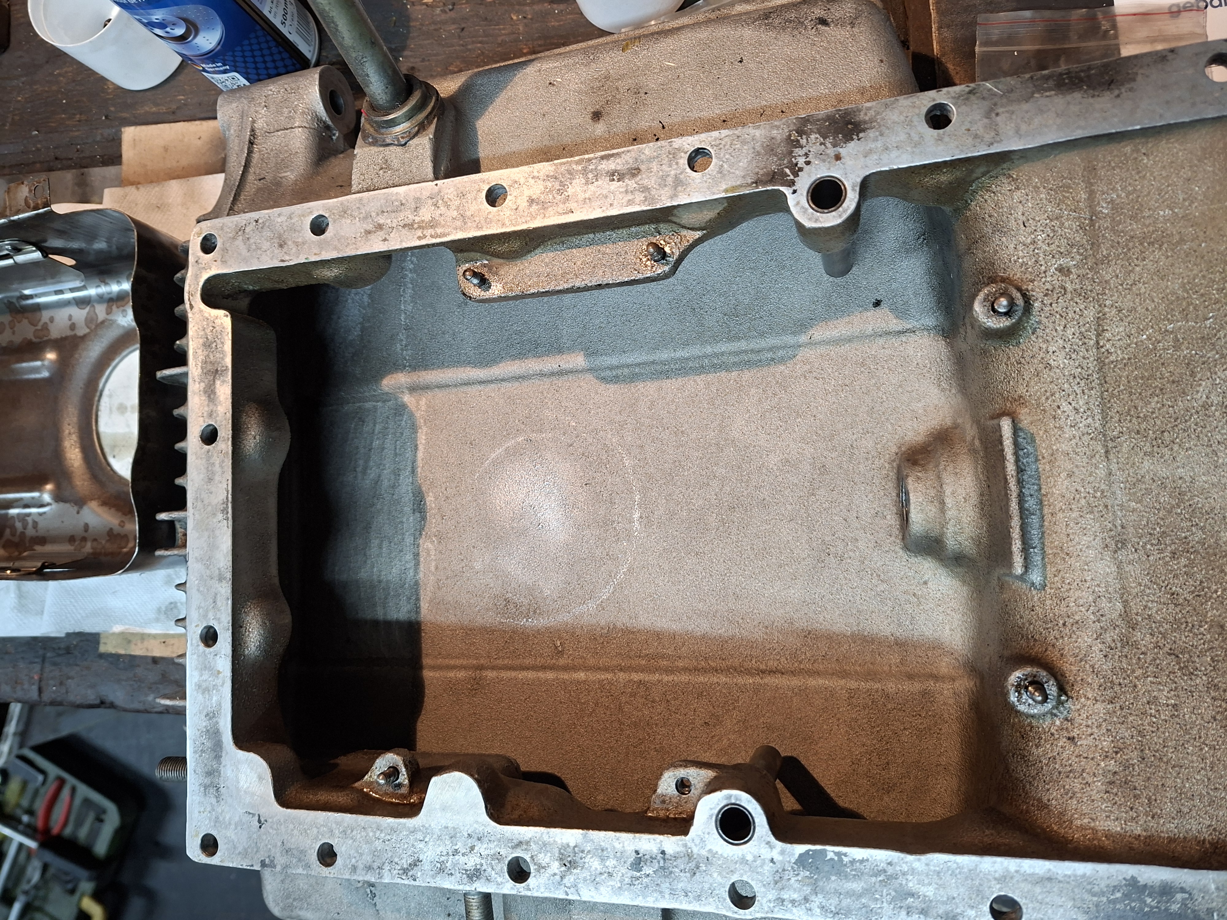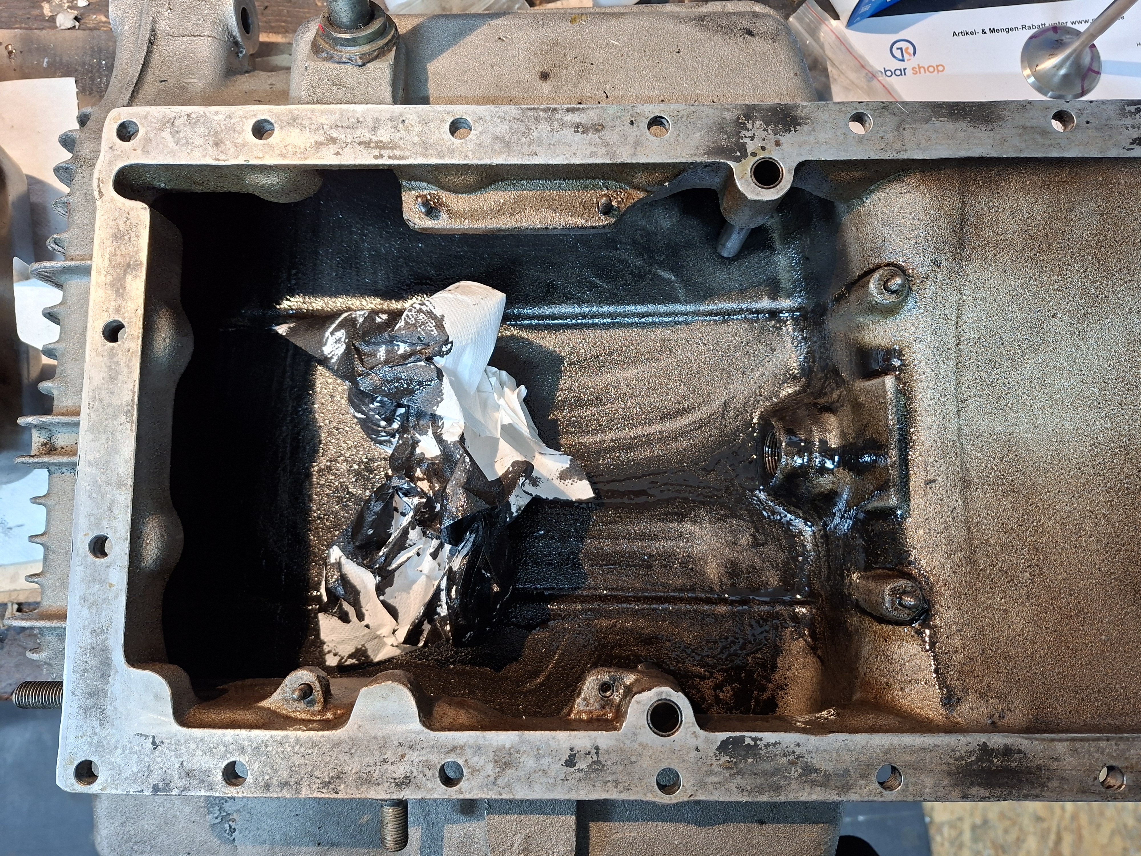 Jetzt war ein bisschen "Drecksarbeit" dran, Ölwanne und Dichtflächen reinigen. Obwohl der Motor noch nicht mal eine Tankfüllung gelaufen war, lag unten schon recht dreckiges Öl. Jetzt kann wieder frisches Öl rein. Ich überlege noch, ob ich weiter gutes mineralisches classic öl fahre oder auf Experten höre, die mir zu hochwertigem synthethischem Öl raten, deren Molekülketten stabiler sind und in einem komplett gemachten Motor eh keine alten Ablagerungen lösen können und die Dichtungen auch alle neu sind...