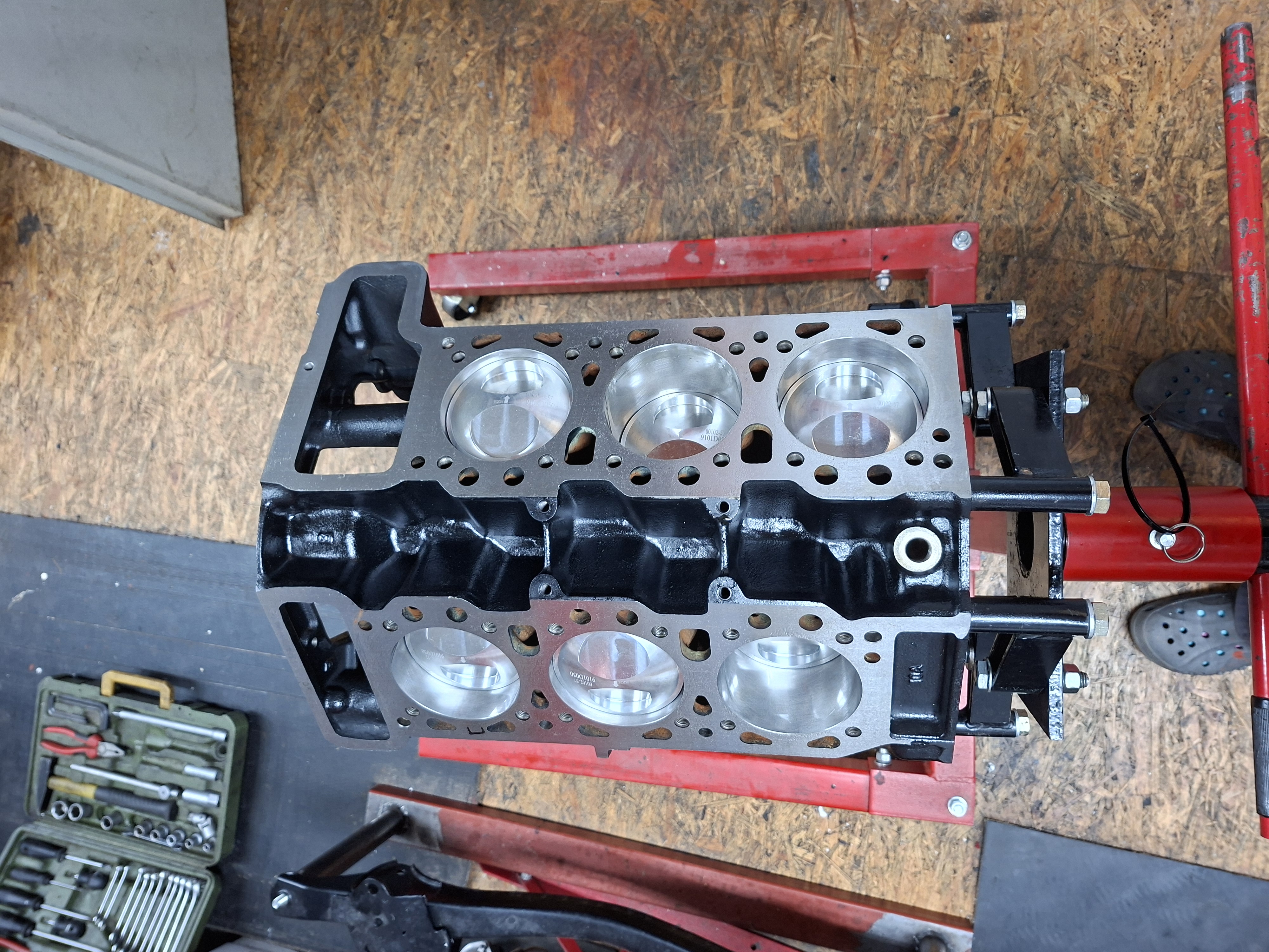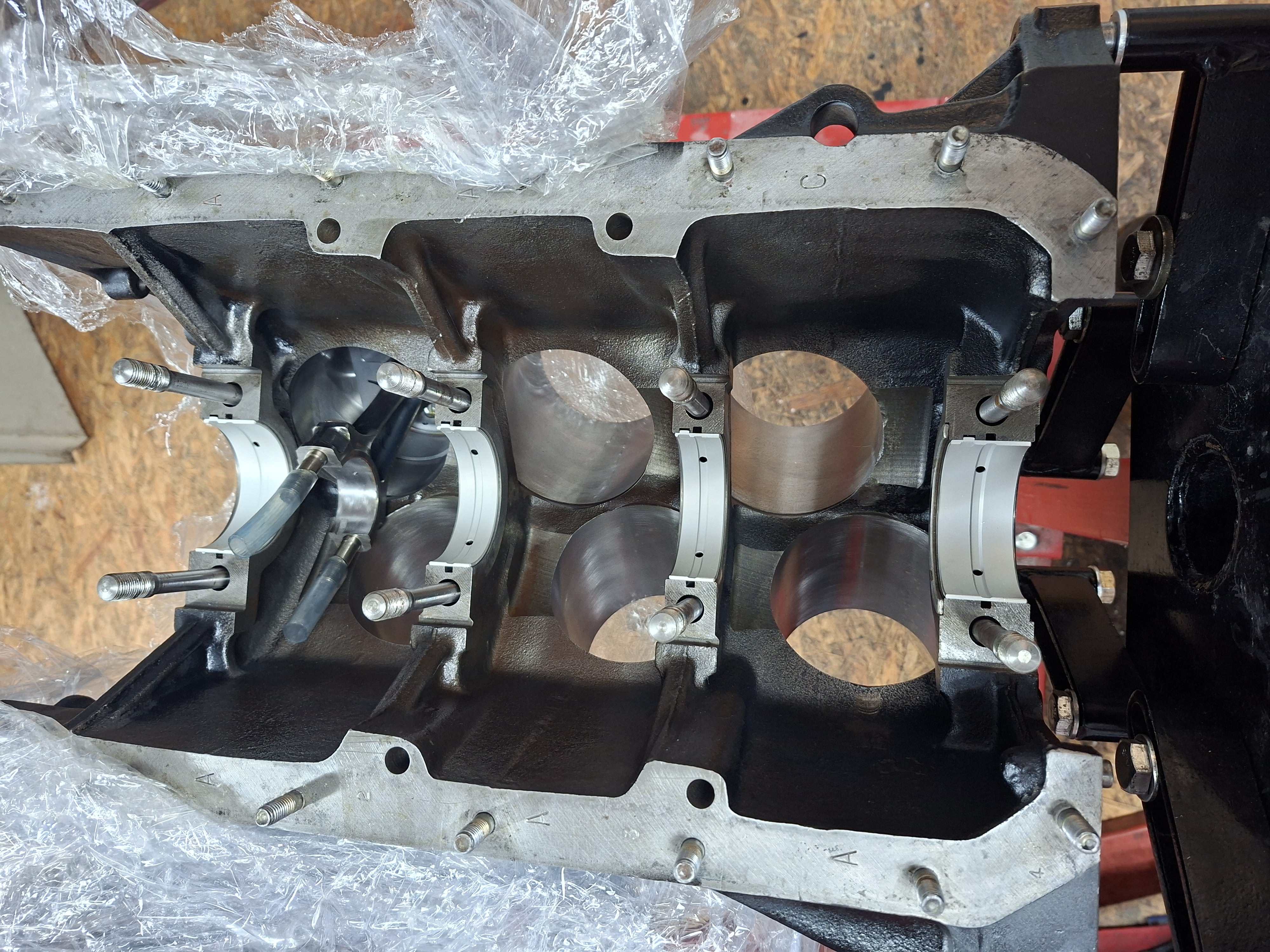 Weiter ging es mit dem Einbau der neuen Lagerschalen, der Kurbelwelle und den Kolben. Dabei hab ich nochmal die Lagerspiele gemessen, Haupt- und Pleuellager mit Plastic Gauge (ca. 4/100tel), KW Axialspiel mit Messuhr (5/100tel).