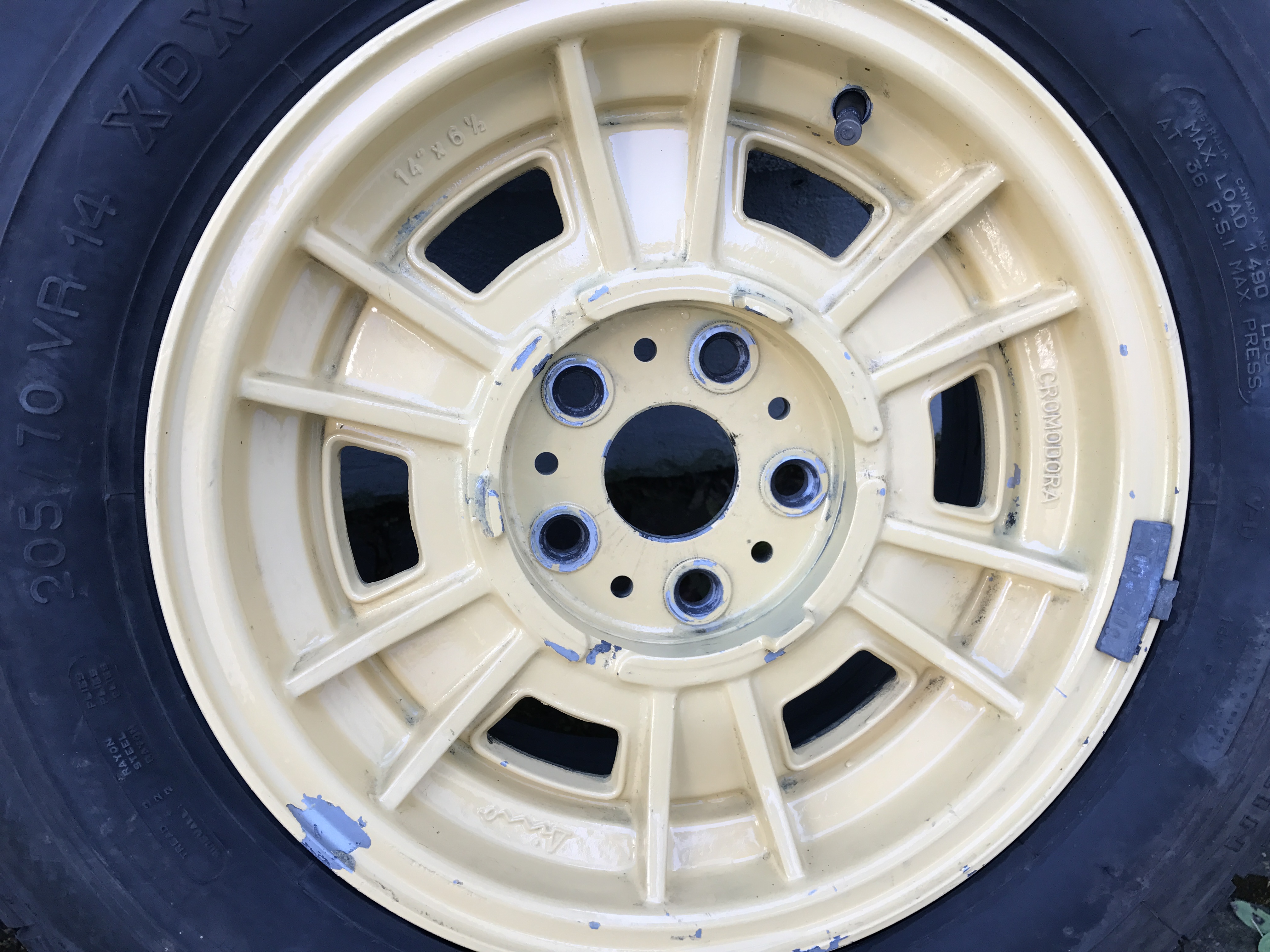 Die Felgen sind gelb lackiert, der Lack kann leicht entfernt werden. Es handelt sich nicht um Reproduktionen, sondern Originalfelgen.