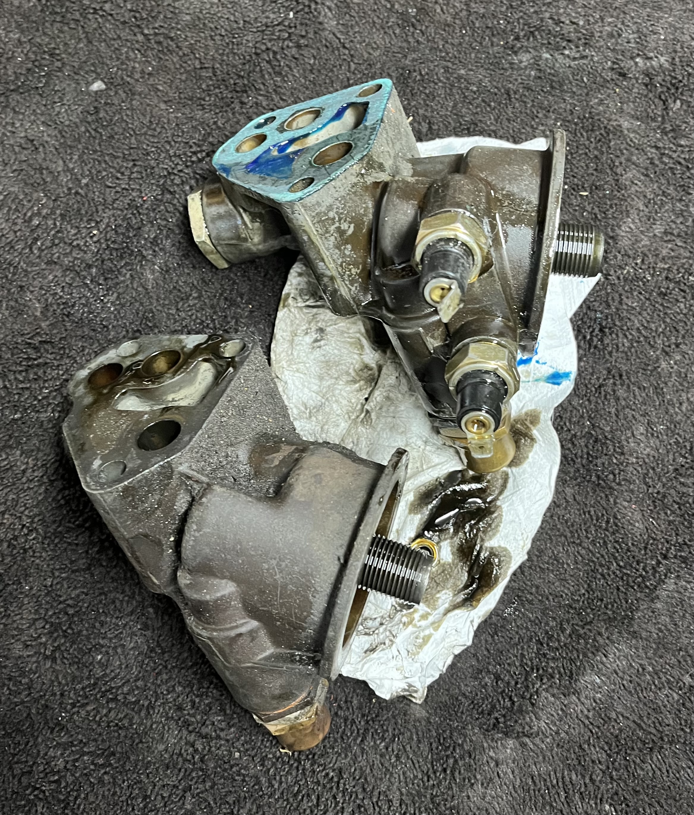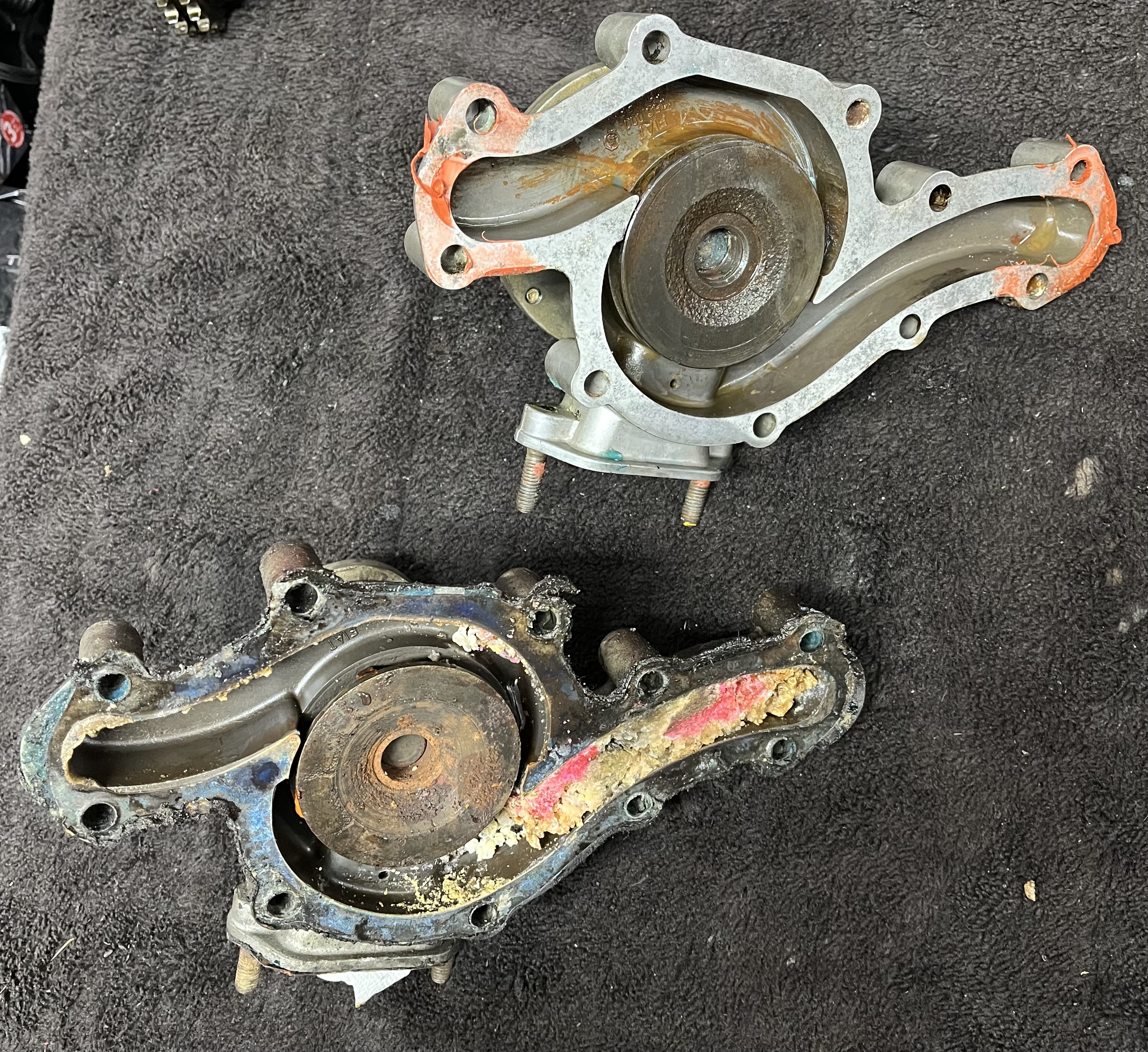 Ebenso vorne am Stirndeckel Sitz die Wasserpumpe. Beim 2,4er gingen die Schrauben gut raus, beim 2,0 sitzt sie auf Stehbolzen, die WaPu war daran ein bisschen festkorrodiert, ging dann aber ab. Das Bild was sich dann ergeben hat war etwas unappetitlich - eingedickte Kühlflüssigkeit. Klar stand der Motor eine Weile, aber die Kühlflüssigkeit wurde vermutlich nur selten gewechselt. Die beiden Wasserpumpen sind verschieden, beim 2,0 die B-Version, beim 2,4 die C. Und beim 2,0 war die falsche Dichtung montiert, die einen Teil des Kanals abdeckt.