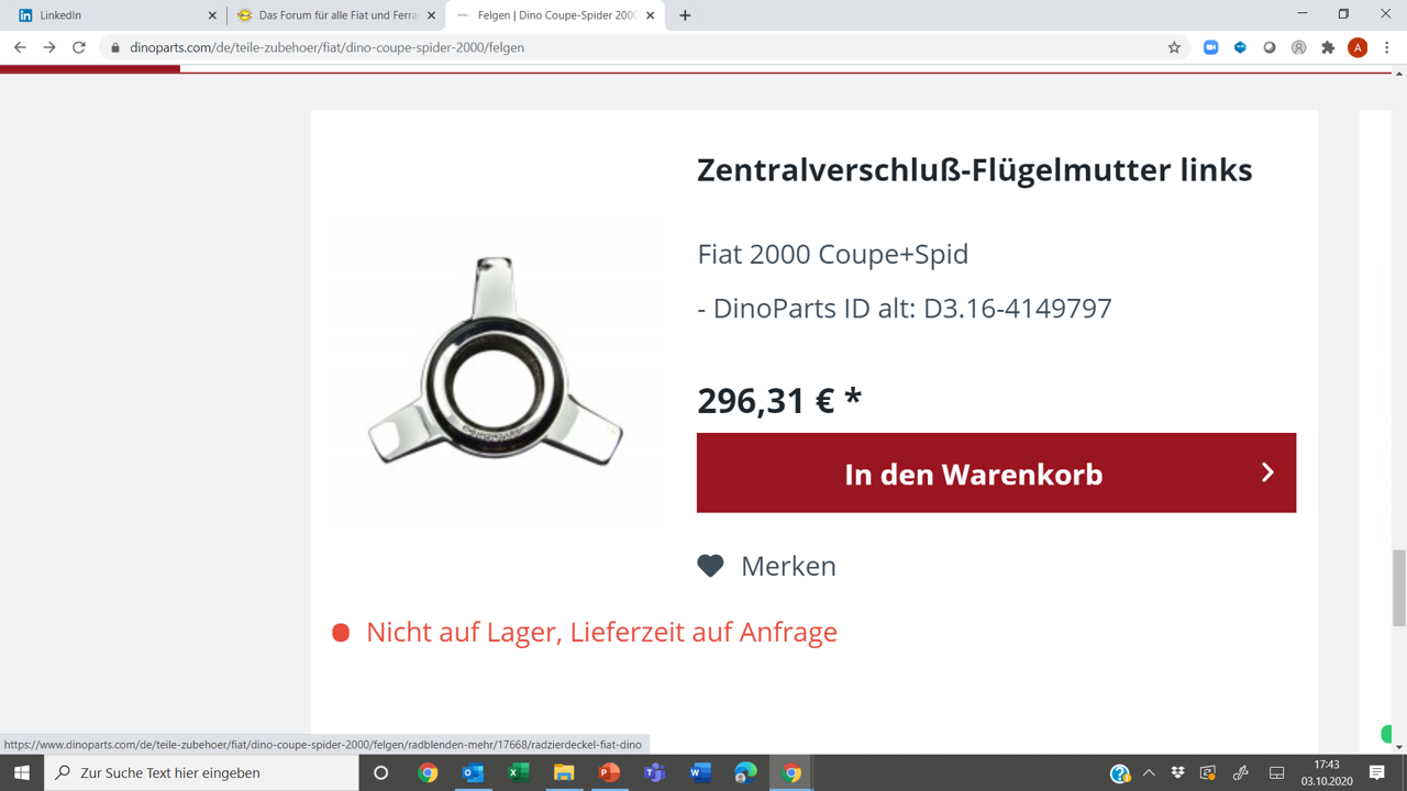 Bei Dinoparts kosten die Flügelschrauben und die Embleme alleine EUR 1423,- (eine dieser Flügelschraube EUR 342.72 (EUR 296,31 zzgl. 16% MwSt.). zzgl. 4 Dino-Radembleme (EUR 54,10))