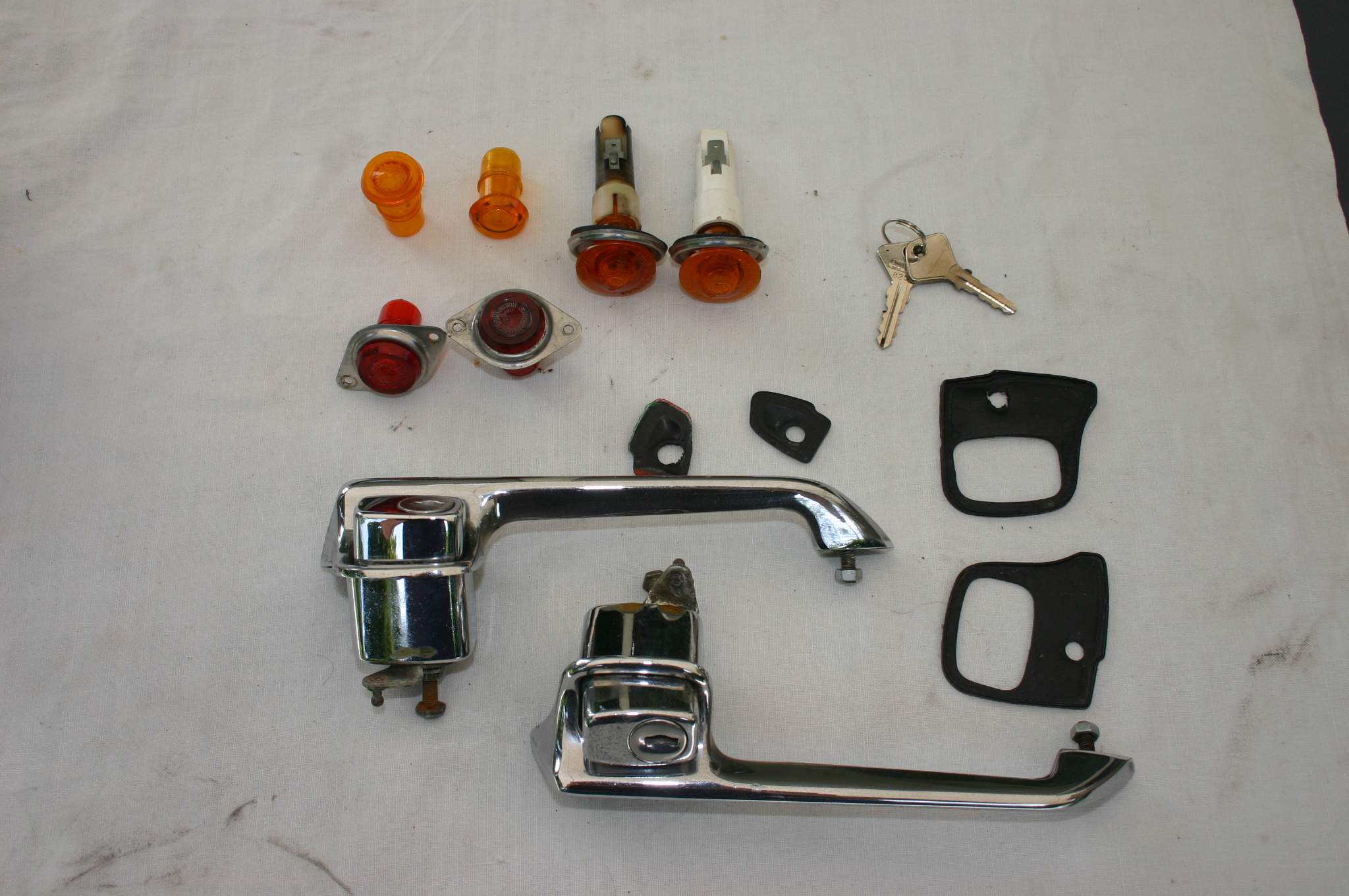 1 Satz Türgriffe für Fiat Dino Coupé, voll funktionsfähig, guter Chrom, mit einem Paar Schlüssel und den Gummiunterlagen