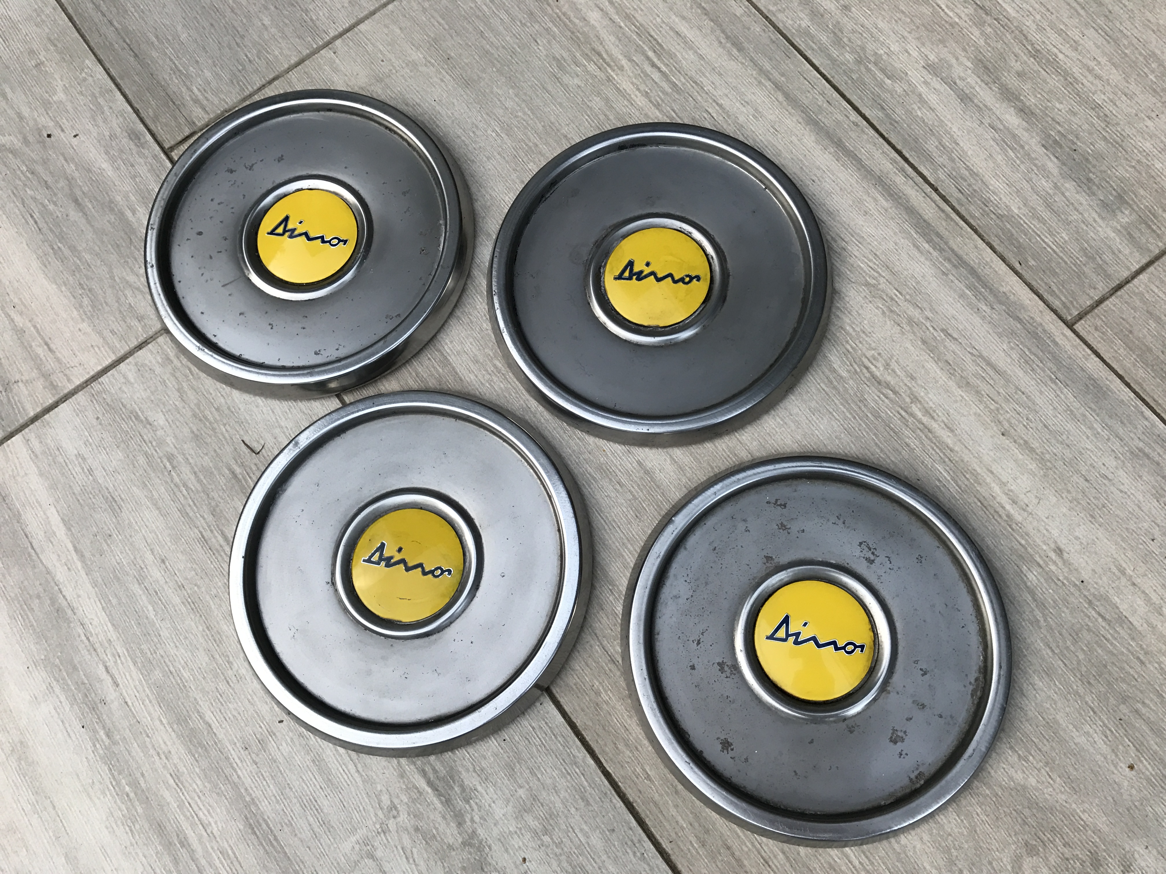 Ich verkaufe 4 sehr gut erhaltene, Original Ferrari Dino Felgen , 5-Loch 14" x 6,5 , mit den zugehörigen Radkappen.