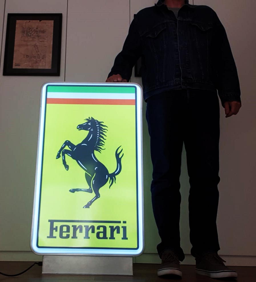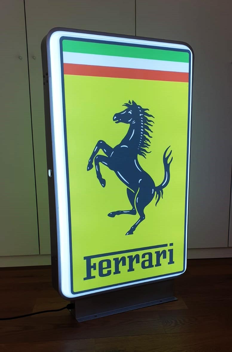 Ferrari Leuchtreklame (Led Technologie) ähnlich jenen welche vor/auf Vertragswerkstätten angebracht ist. Die Maße mit Fuß sind: 100 x 55cm