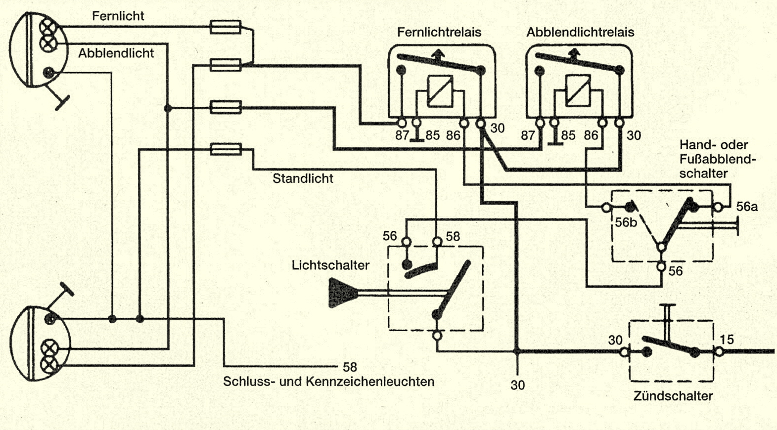 2008 hatte ich in der BM mal einen Artikel zu dem Thema geschrieben. Hier ist der Schaltplan, wie du das Licht schalten musst. Wichtig ist die Klemme 30 bzw. die die Stromversorgung für die Scheinwerfer übernimmt. Wenn du hier den Plus direkt von der Lichtmaschine abnimmst, hast du an den Schweinwerfen 13V und weißes helles Licht. Aber nur, wenn auch die Masse-Versorgung stimmt.