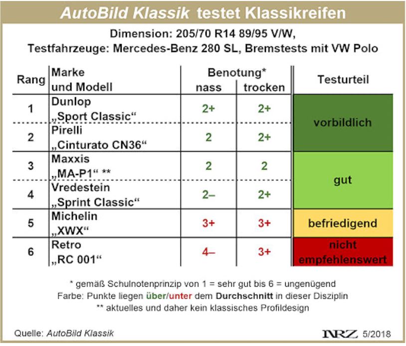 habe vor ein paar Tagen ein Bild vom AutoBild Klassik Klassikreifen-Test für die Dimension 205/70 R14 aus dem Jahr 2018 bekommen...