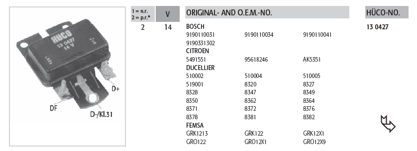 das ist ein Hüco 13 0427 Regler, 14 Volt Ausgang. Empfehle ich allerdings in der Gehäuseform 13 0723 mit isolierten Steckanschlüssen, dann muss man auch keine unisolierten Steckfahnen dranschrauben wie bei der Dinoparts Variante. Kostet ca 15-20 Euro.