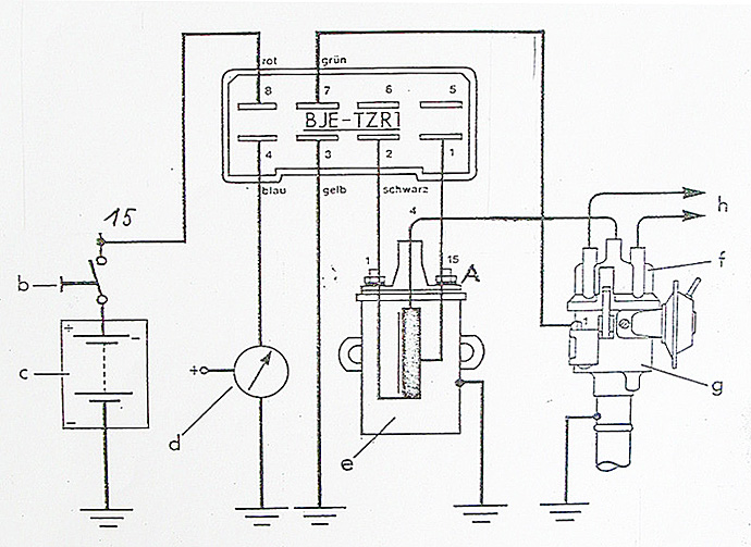 Rot/Grün/Schwarz: An Magnetabnehmer identische Farbe. Blau: Batterie Plus. Gelb: Zündspule Minus
