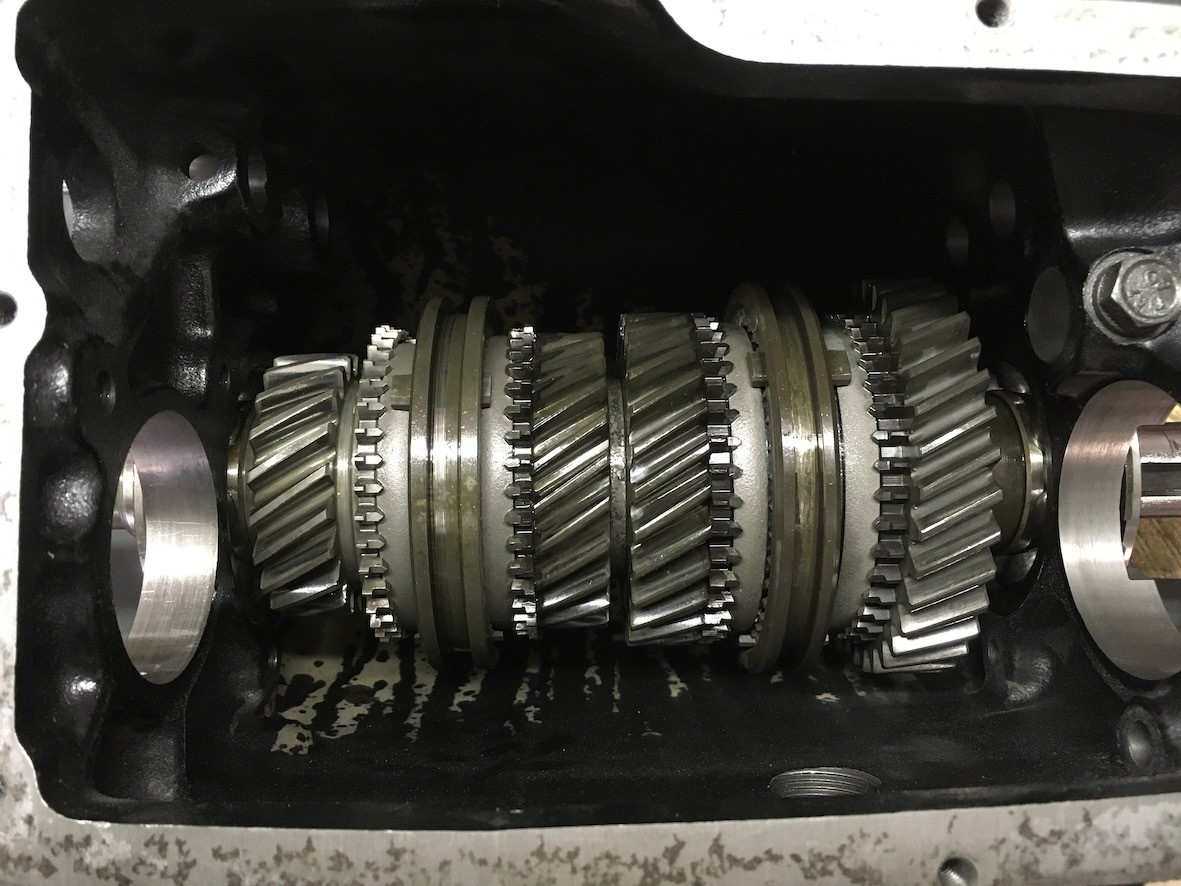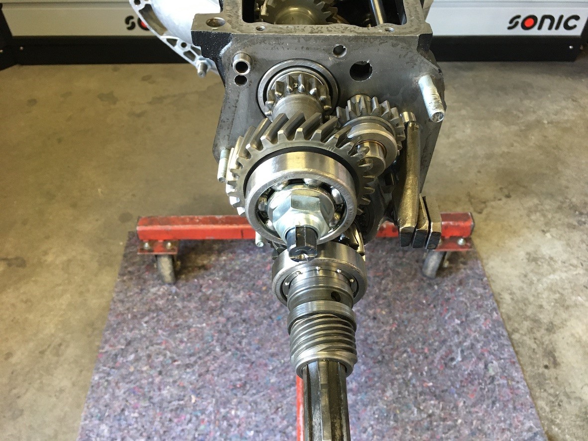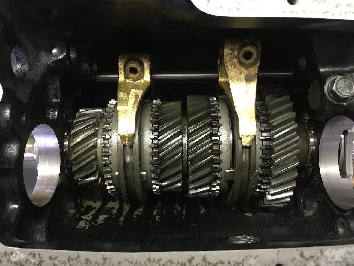 Hier kann man den außerhalb liegenden fünften Gang sehen (großes Rad) und das kleine gerade (nicht schräge) Rad für den Rückwärtsgang