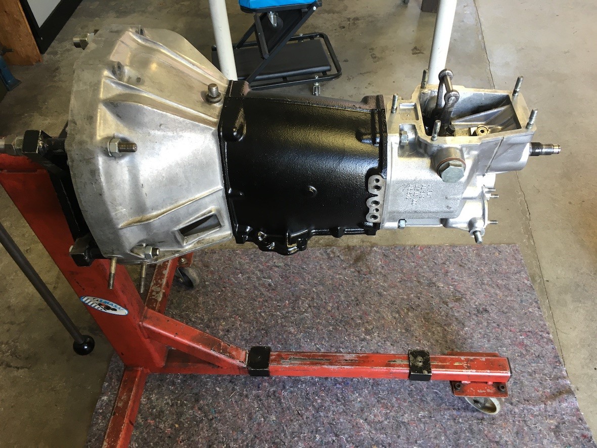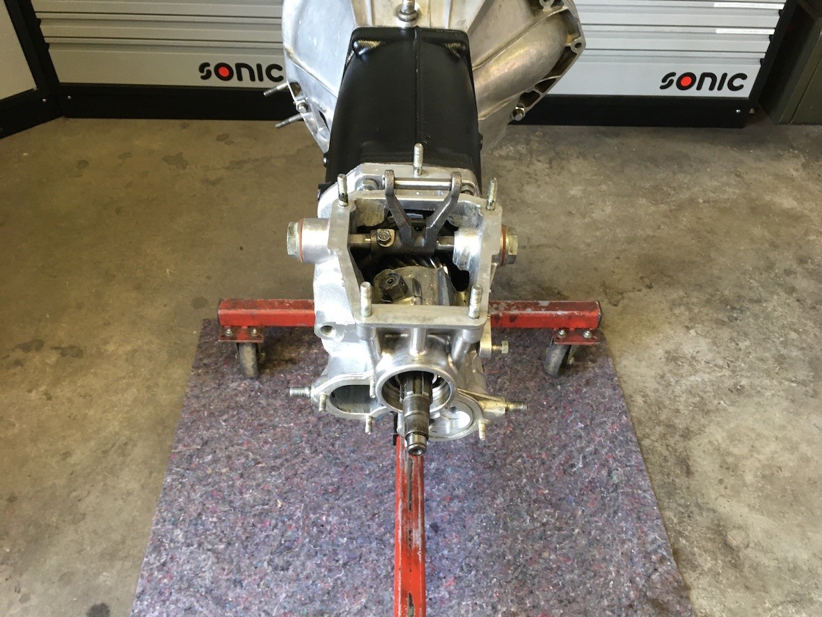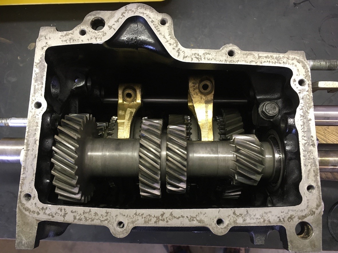 Hier kann man den außerhalb liegenden fünften Gang sehen (großes Rad) und das kleine gerade (nicht schräge) Rad für den Rückwärtsgang