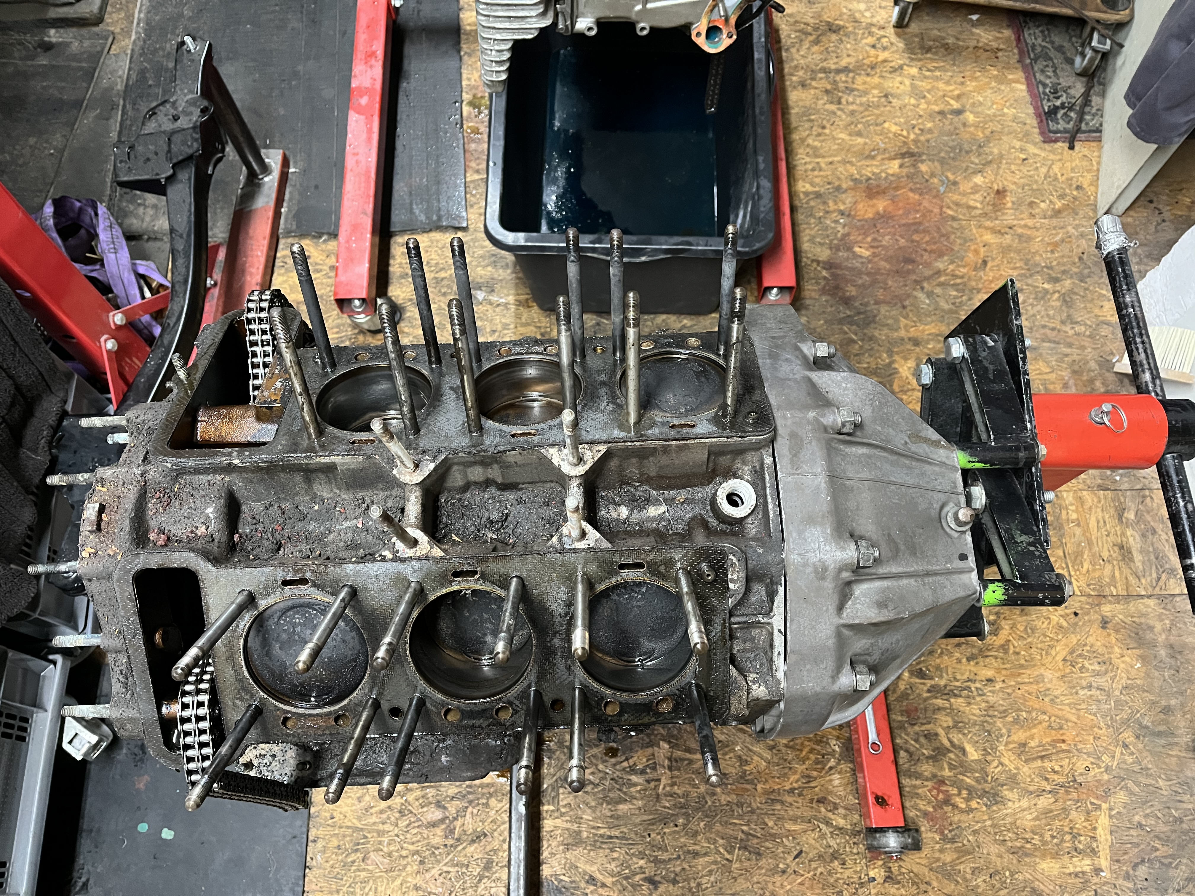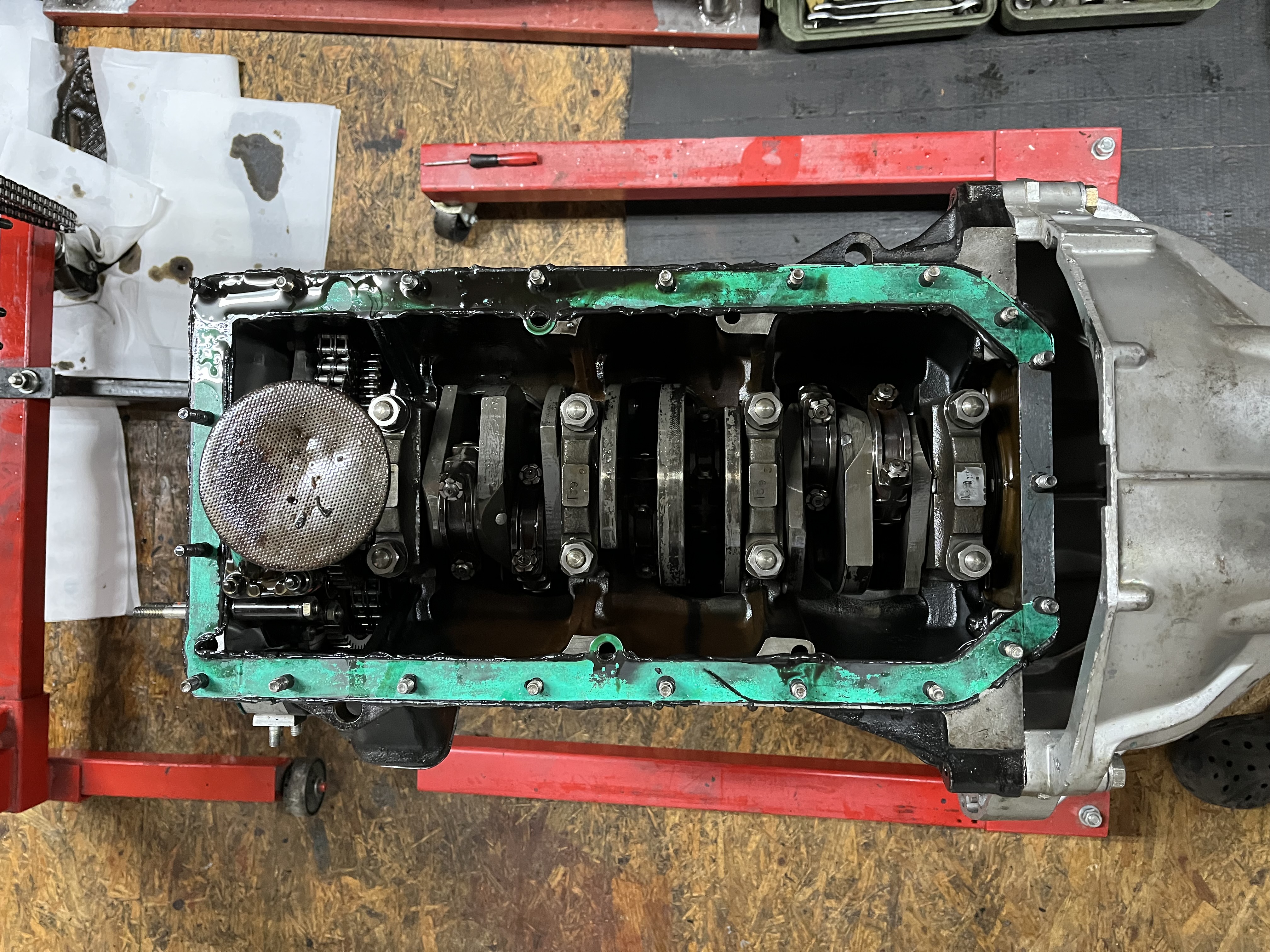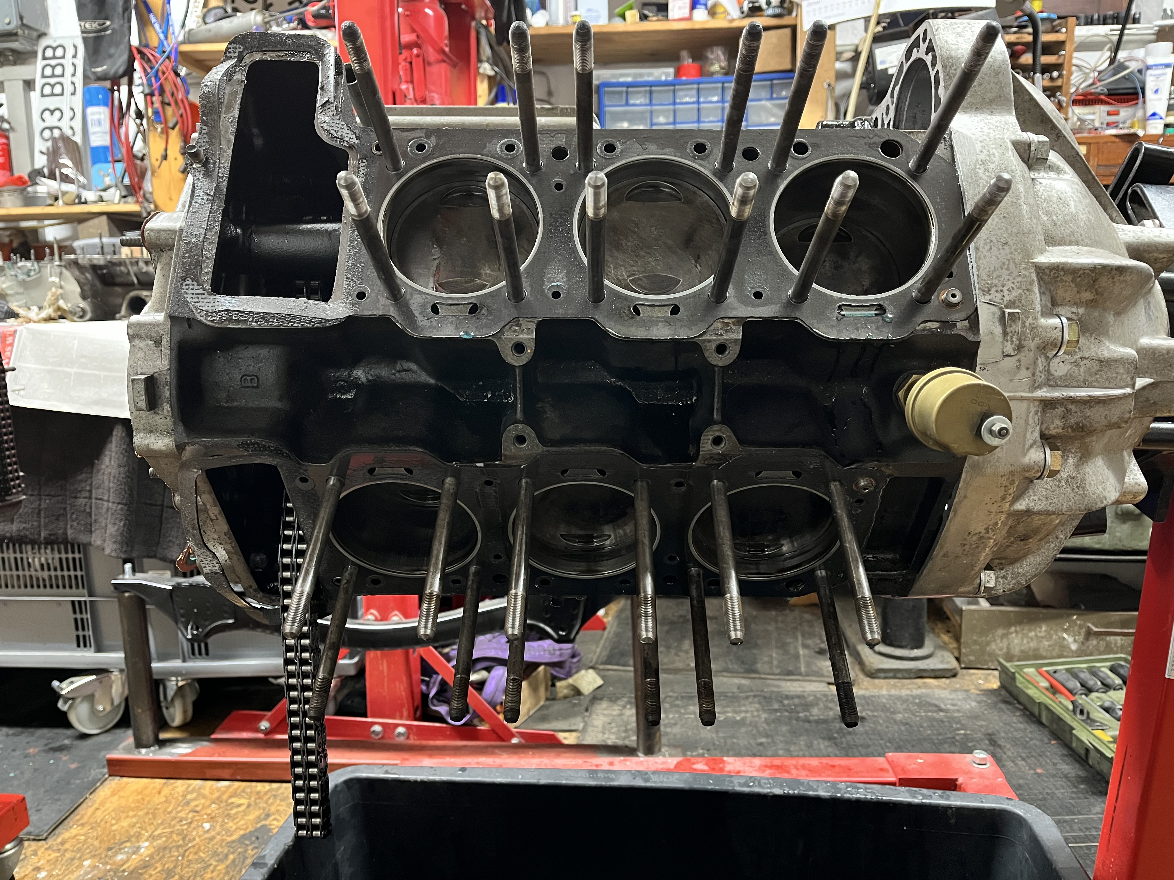 Als Nächstes habe ich die Blöcke auf den Kopf gedreht um die Ölwanne abzunehmen. Die muss runter bevor der vordere und hintere Deckel entfernt werden kann - um danach die Pleuel und Kolben sowie danach die Kurbelwelle auszubauen.