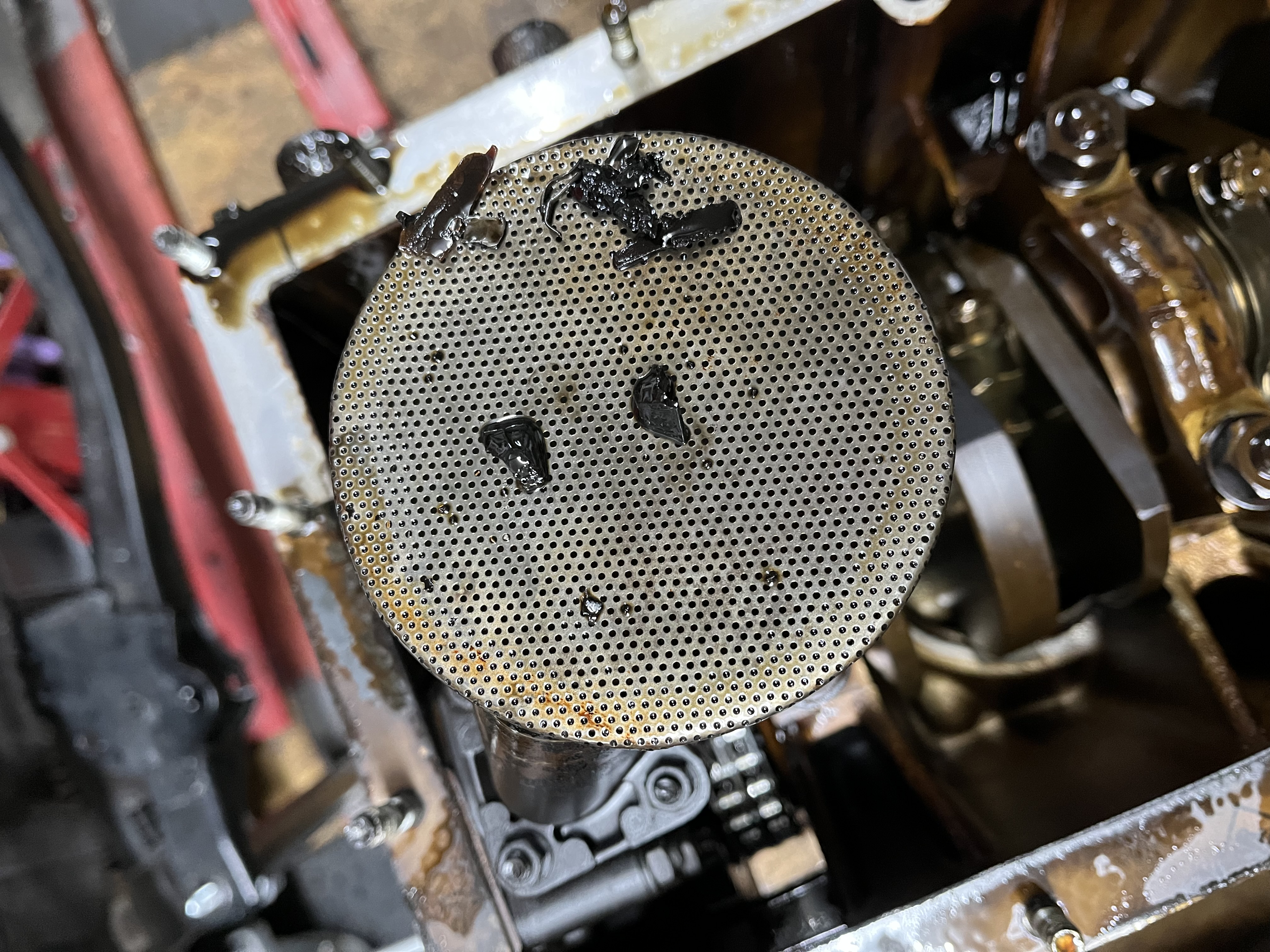 Nach dem Abnehmen saßen beim 2,4er ein paar (weiche) Zutzel der Dichtmasse am Ansaugsieb. Beim 2.0er allerdings hingen dort ein paar Metallstücke - beim Blick in die Ölwanne war klar woher die kamen, da lagen nämlich die Reste einer abgebrochenen Gleitschiene drin. Die wurde wohl mal ersetzt, weil sie gebrochen ist/ist dann reingefallen und wurde drin liegen gelassen…