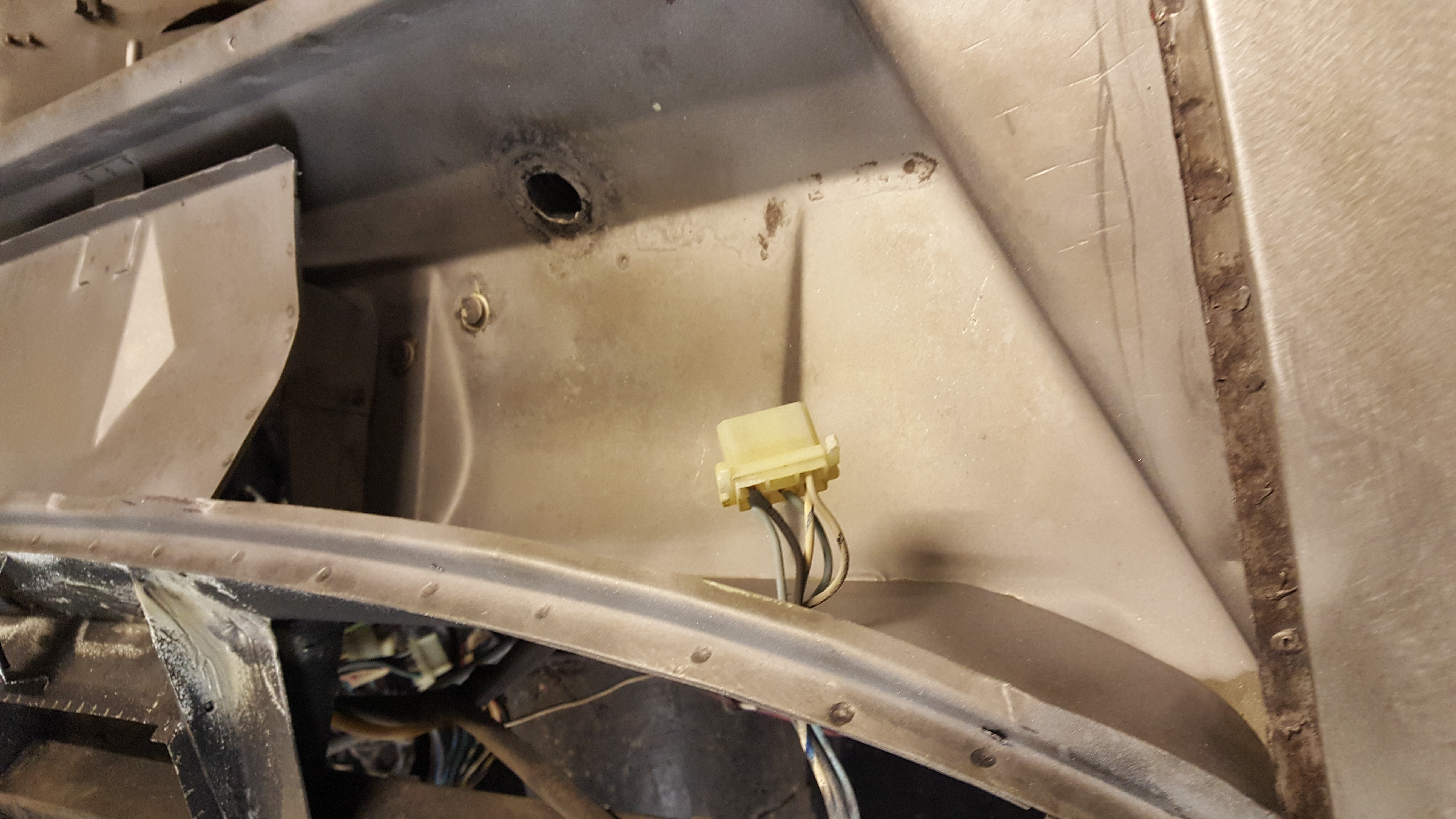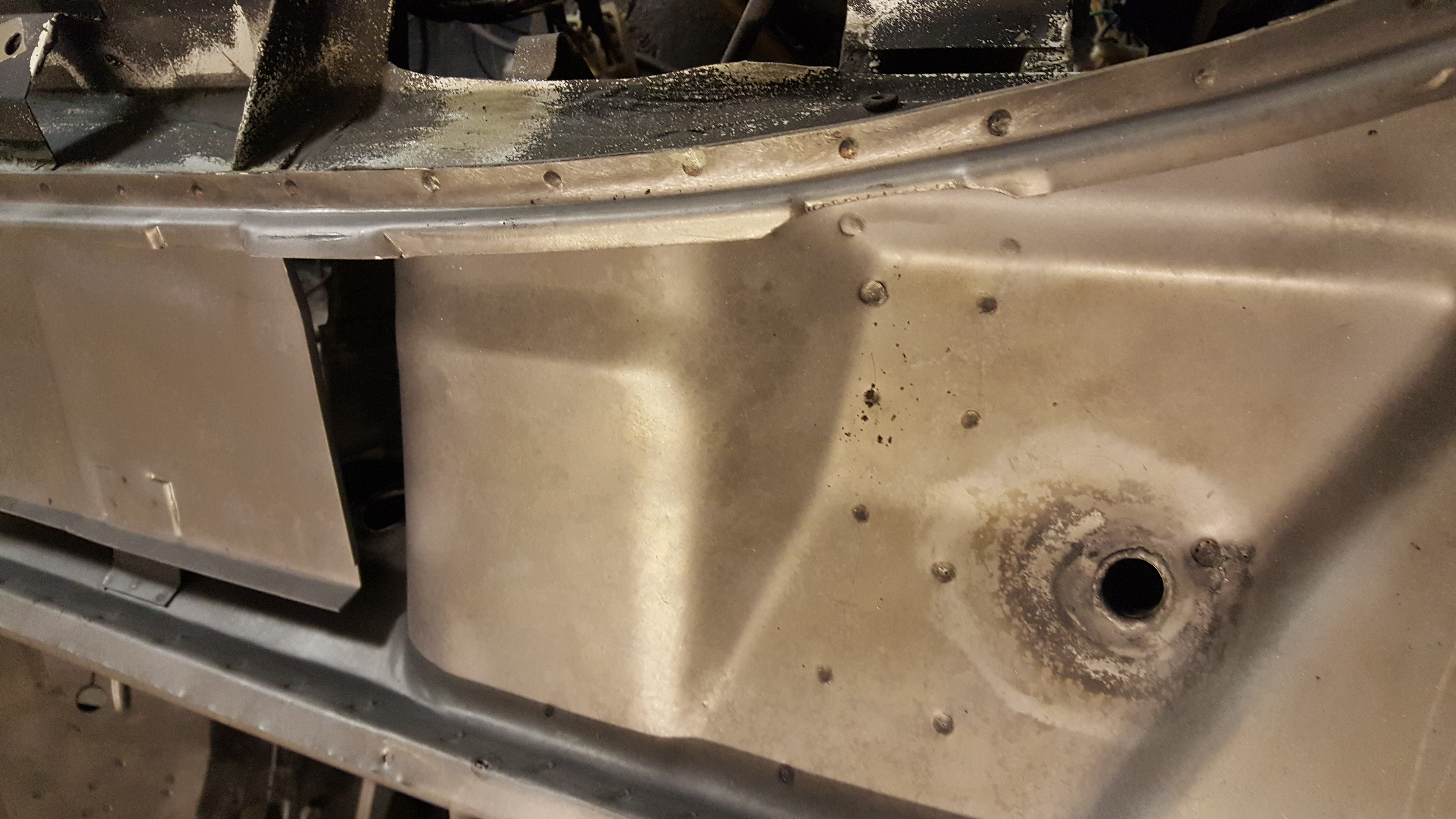 Das nächste Bild zeigt den Unterbau des vorderen rechten Kotflügels; wie man sieht, ein vollkommenes Desaster. Fast alle Bleche wurden neu eingeschweißt, der Weg für den Zuluftschlauch zu gebrutzelt, aber auch sonst ist fast kein Blech ungeschweißt geblieben, die A-Säule würde ich als stark perforiert bezeichnen. Jetzt wird mehr und mehr klar, warum die Türen schwer schlossen. Die ursprünliche Substanz wurde durch eine Hilfskonstruktion ersetzt.