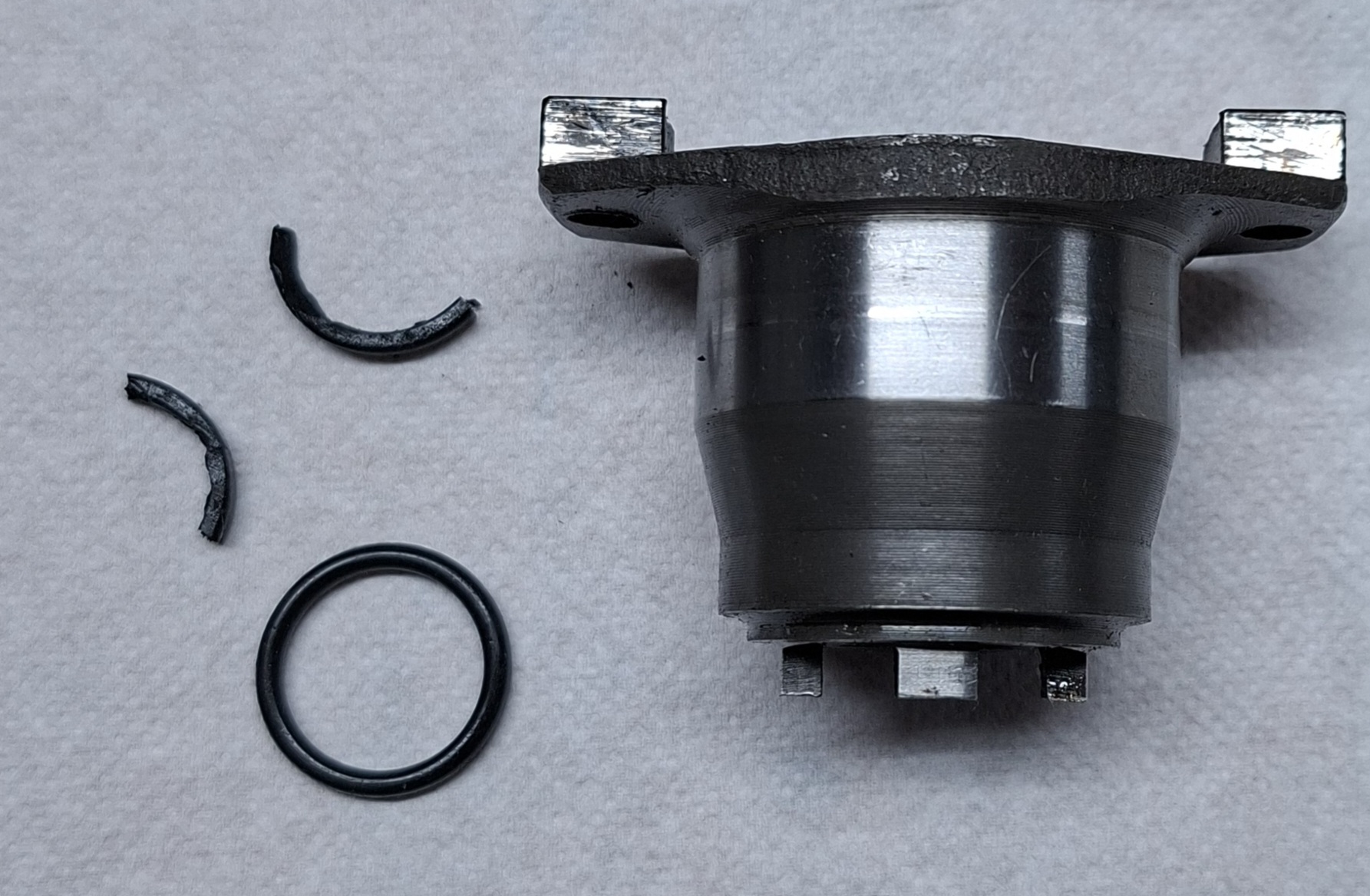 Eine andere "Kleinigkeit" ist der O-Ring der im Antrieb für den Verteiler durch die Nockenwelle steckt. Er soll verhindern, dass Öl in den Verteiler kommt. Das kann er aber nicht mehr, wenn er völlig veraltet und ausgehärtet ist. Ich vermute beim 2 Liter Motor war noch der erste drin - es hat gut 30 Minuten gedauert, den in Fragmenten rauszustochern...siehe Bild, zusammen mit einem neuen O-Ring.