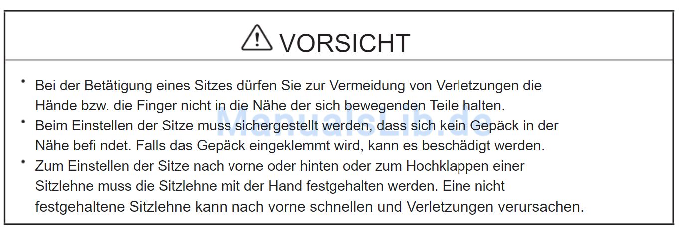 Es ist gefährlich Gegenstände, wie ein Kissen zwischen der Sitzlehne und dem Rücken zu verwenden, weil eine richtige Sitzposition nicht eingehalten werden kann und bei einem Aufprall die Funktion der Sicherheitsgurte beeinträchtigt wird, was zu einemschweren Unfall mit sogar tödlichen Verletzungen führen kann. Legen Sie keine Gegenstände unter den Sitz: Ein Gegenstand kann eingeklemmt werden und eine richtige Sitzverriegelung verhindern, was zu einem Unfall führen kann.